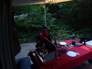 Sur la route on décide de s’arrêter à Squamish dans un petit camping tout près d’une chute vertigineuse: Shannon Falls de 335m (même si on ne la voit pas très bien avec la boucane). On s’installe et on pourra prendre nos douches ici. Souper sera du poisson qu’on a de congelé quand on était avec les amis 🤮 degueulasse c’est pas de la morue c’taffaire la, c’est quoi! T’avais raison Claude de pas vouloir en manger…on jette les autres morceaux congelés ,puis écriture emmitouflé comme on peut avec la lueur du fanal (toujours interdiction de faire des feux) et dodo.