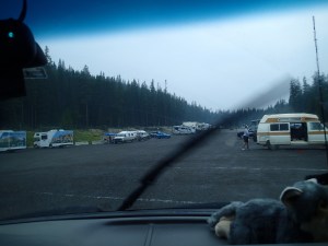 Puis la pluie vient de s’y mettre et ce n’est pas chaud! Donc on ni verra rien avec en plus la fumée …y a vraiment pas plus grande déception pour nous car on aperçoit à peine les Glaciers. Je pense que même s’il avait fait beau on ne les verraient quand même pas car ils doivent être accessible qu’en faisant de longues randonnées et malheureusement nous n’avons plus ce temps à cause des fermetures de route et notre date de retour qui approche.