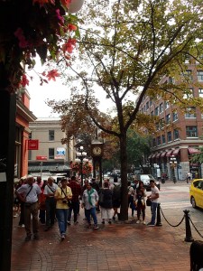 Puis grand saut: on entre dans Vancouver, wow grande métropole. Le port est gigantesque, quai pour les paquebots de containers, quai pour les trans Pacifique, quai pour les hydravions, ça n’en finis plus…..on finis par trouver un stationnement, pas évident dans le centre ville et surtout avec la van. On utilise une autre application de la ville pour payer et nous voilà partis. Recherche de l’horloge à vapeur (en réalité elle est maintenant complètement électrique!!) qui sonne à toutes les 15min. Après quelques minutes de recherches la voilà et voici ce qu’elle nous fait entendre »….