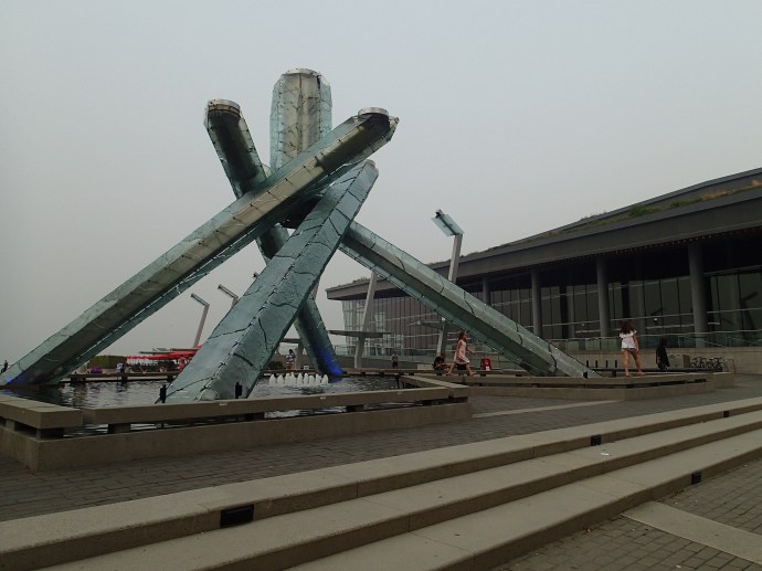 Alors la place du Canada est très bien situé, ici est encore bien présent l’esprit Olympique et même la structure ayant servie à la faire briller en 2010 est encore présente. Nath repère une attraction qui s’appelle FlyOver Canada, un genre de cinéma 3D avec des sièges qui bougent!!! On se laisse tenter par l’expérience (un peu dispendieux mais après tout tant qu’à y être autant jouer le jeux), on est chanceux car encore des places pour la représentation qui débutera dans 5 minutes!! Wow c’est comme si on parcourait le Canada en Delta plane d’un Océan à l’autre en environ 10minutes. Les effets sont hallucinants (pas surprenant car Moment Factories à participé aux images et montage), c’est tellement réaliste qu’a certain moment on lève nos pieds car on croirait presque toucher le sol….à l’occasion on reçoit même des petites gouttelettes d’eau lors de passage de chute d’eau ou autre…. Wow, on sort complètement mystifiés et enthousiastes de l’expérience!!! Alors, il se fait tard on va sortir de la ville et prendre la direction de Whistler.