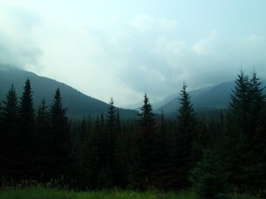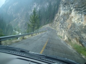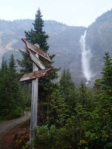 On reprends la route puis plus loin un autre attrait: Takakkaw Falls, la 2e plus haute chute au pays….255m. Ok on essaie même si on doit aller s’enfoncer 12km dans le bois. Ha un campground…c’est plein! ( pas surprenant avec le retard causé par l’accident)…aller reprenant la Route du bois avec la van….oups ça monte pas mal et des virages en lacet dont un assez serré ( pas tout le monde qui peut passez ici). En temps normal avec le beau temps cette route doit être magistral! On arrive on met les imperméables et allons au pied de la chute qui fait tout un vacarme! Très beau et puis on essaie d’apercevoir tant bien que mal les sommets avec une lueur de glacier…