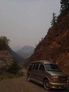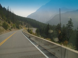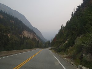 Dormis popir exception des trains qui ont passé pendant la nuit. On se fait notre café, on déjeune puis on décolle en direction du fameux « Parc National des Glaciers », où il y est répertorié pas moins de 430 Glaciers (le paradis) 🙃. On sait que ce sera beaucoup de route mais faut ce qu’il faut. En chemin en refaisant l’itinéraire 2-3h semble s’avoir ajouter! 😲. Ha!, il nous font faire un méchant détour car la « route 1, la transcanadienne, est fermée pour collision avant Revelstoke et pas sûr de s’y rendre non plus car beaucoup de feux de forêt, cela dépendra des vents. Donc arrêt à l’info centre de Pemberton: pas de routes fermées pour les feux car les vents ont changés de bord 🙂 mais l’accident, on ne sait pas combien de temps il fermeront😕! Étant à 6h de route de là, on verra bien en chemin, on pense qu’on devrait être Ok! C’est repartis, encore une fois la route panoramique est de toute beauté, dommage pour la fumée qui nous empêche de voir au loin.