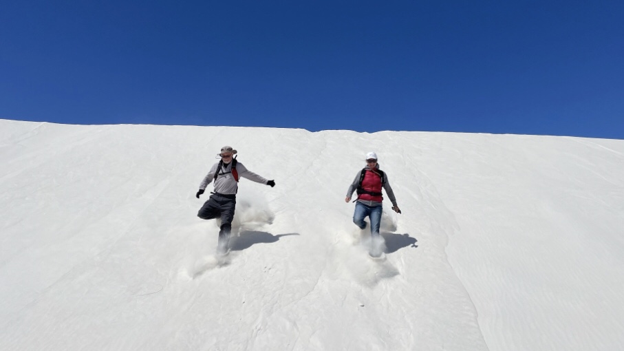 Rien de délicat là, elle est gigantesque (peut être dû au fait qu’on est si près et son environnement si particulier, jugez par vous même avec ces photos… En tout cas ici on se fait venter! On peut donc comprendre l’érosion par le vent. On arrive à prendre le réseau pendant qu’on est en haut et oups on apprend que le papa de Nath est à l’hôpital mais de ne pas s’inquiéter 😟. On devrait avoir plus de nouvelles en fin de journée après des examens. Ok Nath se contrôle, c’est écrit: ne pas S’INQUIÉTER!