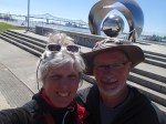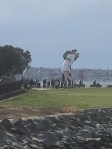 Bon on va dîner et on se prend en photo avec la boule (l’emblème de la ville?) et c’est là qu’on voit le navire de l’armée le USS KIDD ( ha c’était ça les affiches, on ne savait pas que c’était un vaisseau). On y va et en plus visite d’un autre bateau spécialement arrivé hier comme un bateau de pirate: le Nao Trinidad!!!! C’est une réplique d’un des vaisseaux utilisé par De Magellan il y a 500 ans. Il a même passé par Québec en 2022.
