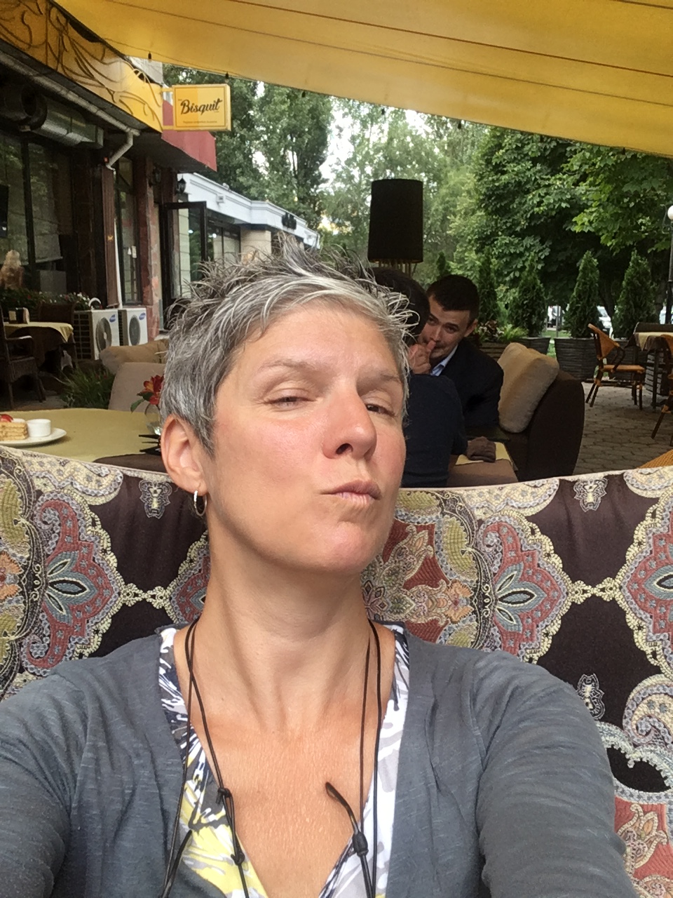 Arriver à l’hôtel on prends une pause avant de se retourner pour le souper. Puis hop on marche à travers cette ville tout à fait différente d’Astana. Mais c’est que cette ville n’est pas nouvelle, il y a de l’histoire et ça ressemble un peu plus au grande ville avec des arbres très haut mais de la pollution😷🤧 aussi et cela même si on est bordé de montagnes majestueuses. Puis on ira à la terrasse d’un restaurant ordinaire et un peu éclectique mais avec un serveur vraiment sympathique et très débrouillard malgré le fait qu’il ne parle pas anglais et que seule Annie arrivera à sortir quelque mot de russe. On passera une très belle soirée où cette belle gang de techniciens nous parleront de leur déboire à leur arrivée à Astana il y a plus de 3 mois et du montage de la scène en même temps que la construction de l’ensemble du site de l’expo. Mais surtout de ses bourrasques de vent dans cette steppe où tout pouvait s’envoler… même une feuille 4×8 en plywood🌬