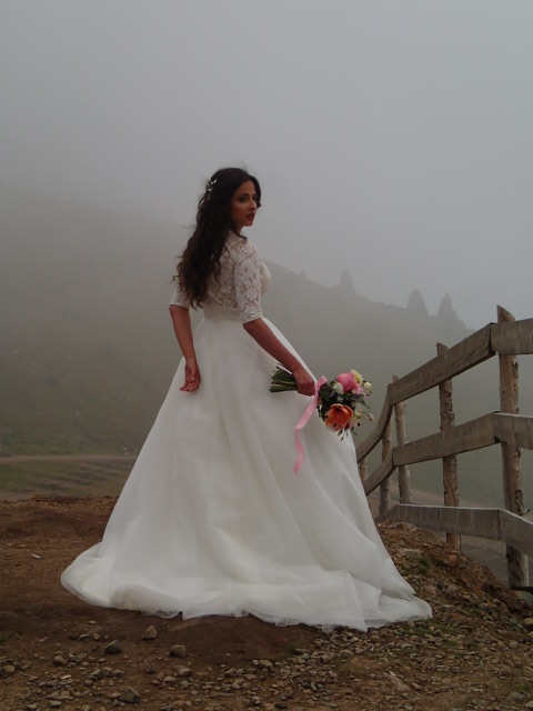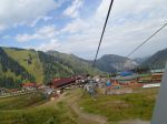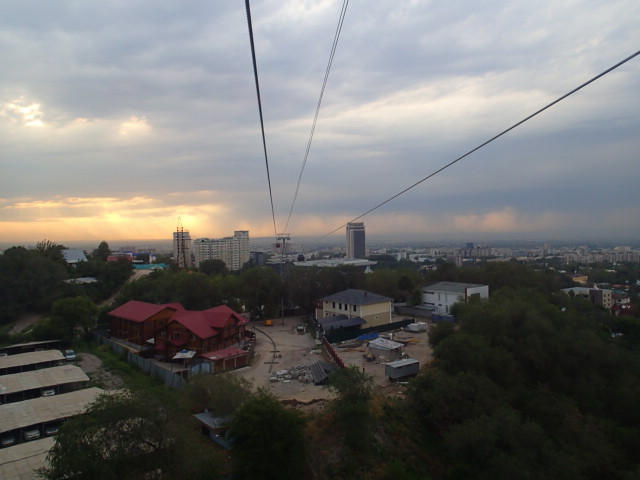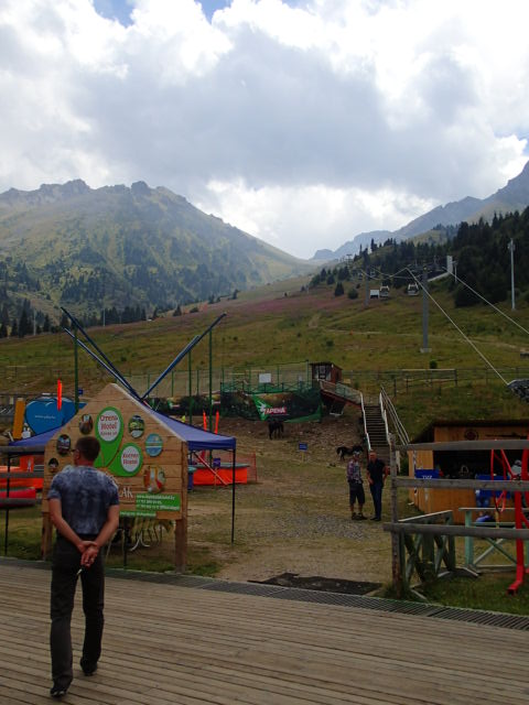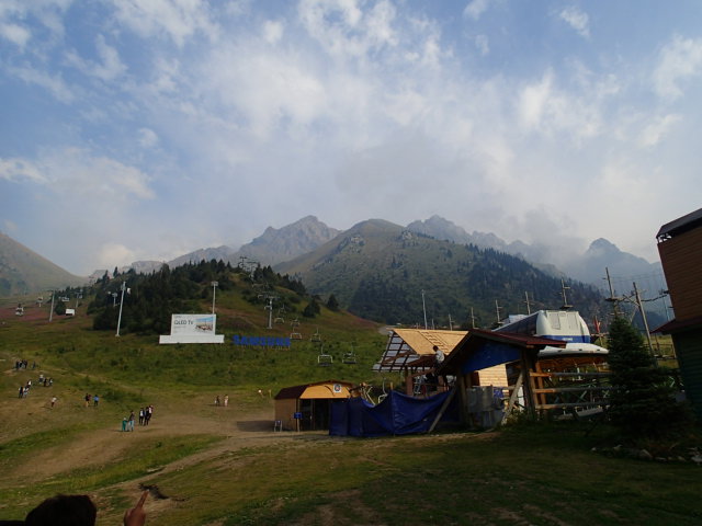 On trouve comment ça marche pour accéder le sommet et on paye une passe pour la journée qui comprends 3 remontés en gondole aller/retour. Ouais mettons que c’est plus une demi journée puisque le dernier départ d’en haut est à 4h et qu’il est déjà 13h. Tout ça pour 3,500 kzt chacun ($14). La 1ère montée dure ~20 min mais le paysage est sublime malgré le fait que les deux autres Monsieurs Kazakhs avec nous dans la cabine sont un peu dans notre bulle! Une fois débarqués, se sont quelques resto avec ses terrasses avec peau de mouton sur les chaises qui nous entourent. C’est vraiment charmant et on prendra une petite pause le temps de faire le plein d’énergie. Ensuite on décide de grimper à pied pour rejoindre le 2e téléphérique question de se faire un peu les jambes… On voit difficilement les sommets qui sont dans les nuages mais c’est vraiment cool et aussi essoufflant puisqu’on commence à sentir l’altitude 2400 m …puis on prends la 3e remontée en gondole car le temps va nous manquer sinon.