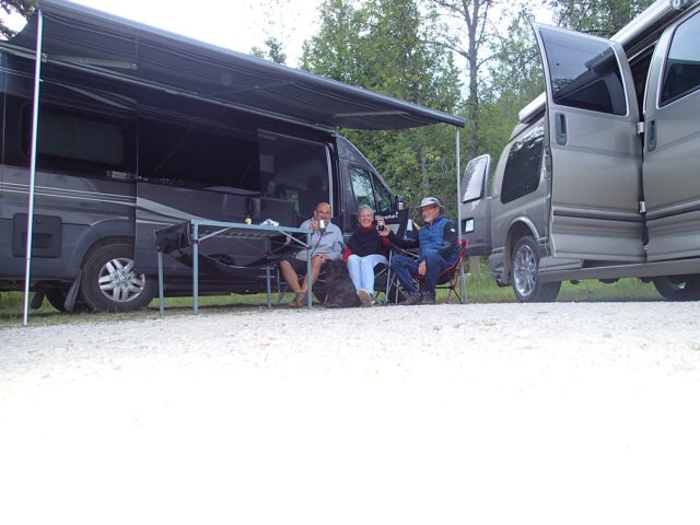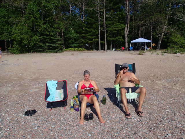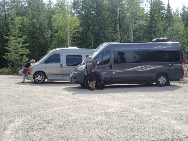 Un moment un jeune homme débarque de son camion ( Denis pense qu’on va se faire avertir). Et bien non, il « capote » sur le vr de Claude…c’est vrai que c’est tout un équipement son Safari Condo!). On fera petite jasette avec Collin et Michelle pendant que Scotch fait buddy avec leur petit chien. Il nous quitte car eux doivent aller rejoindre le ferry. (Ils arrivaient de Thunder Bay!!!!)