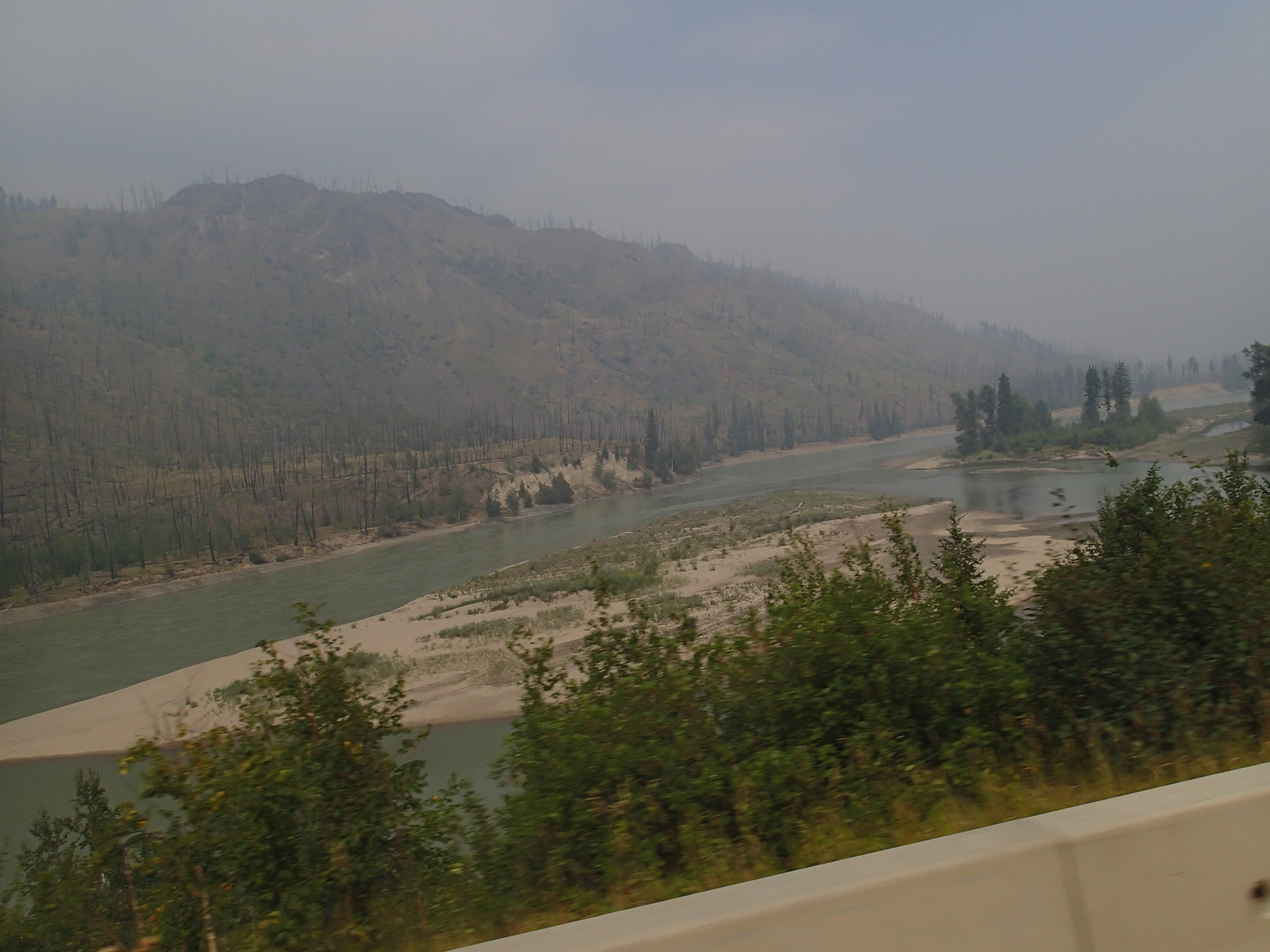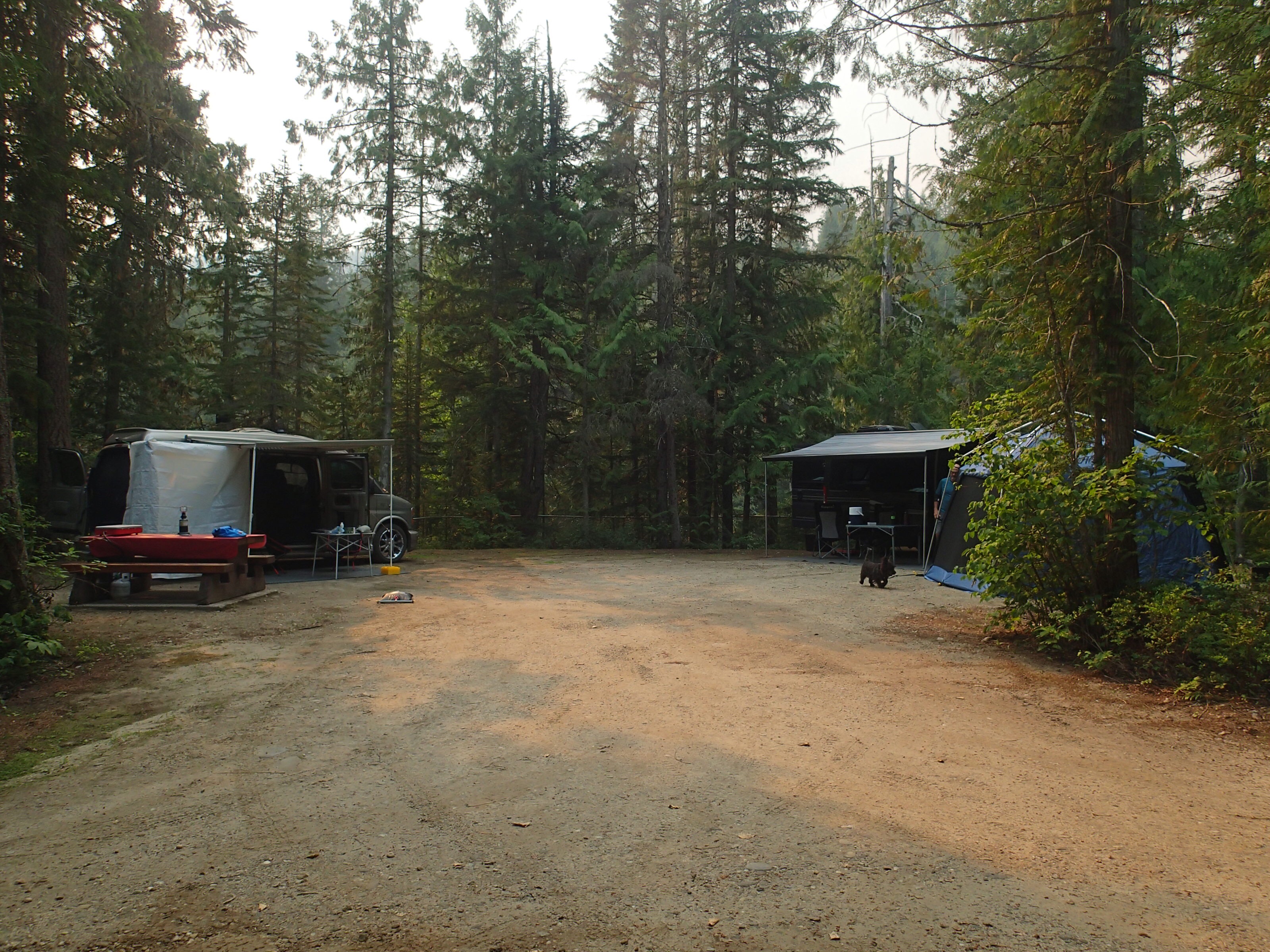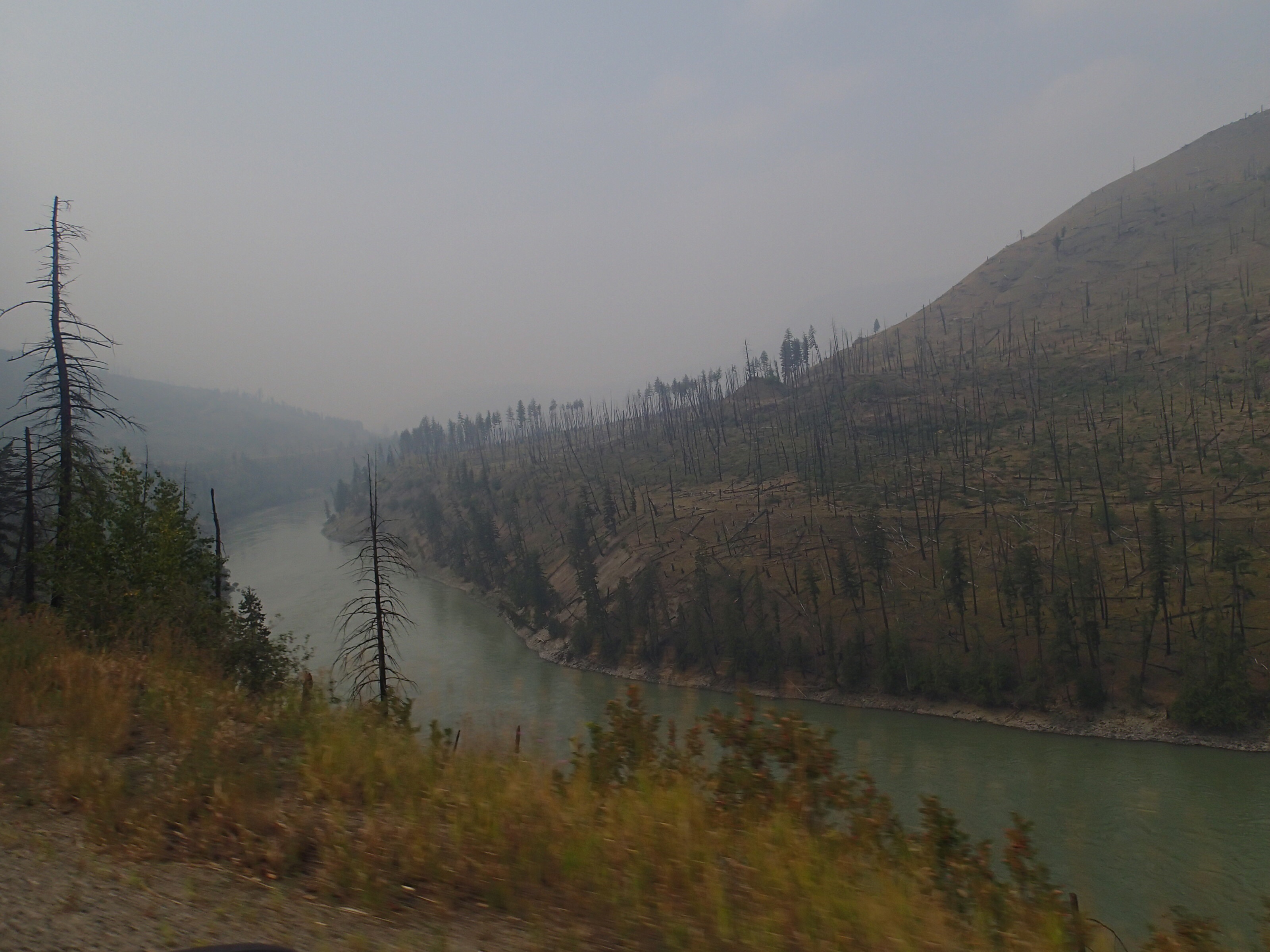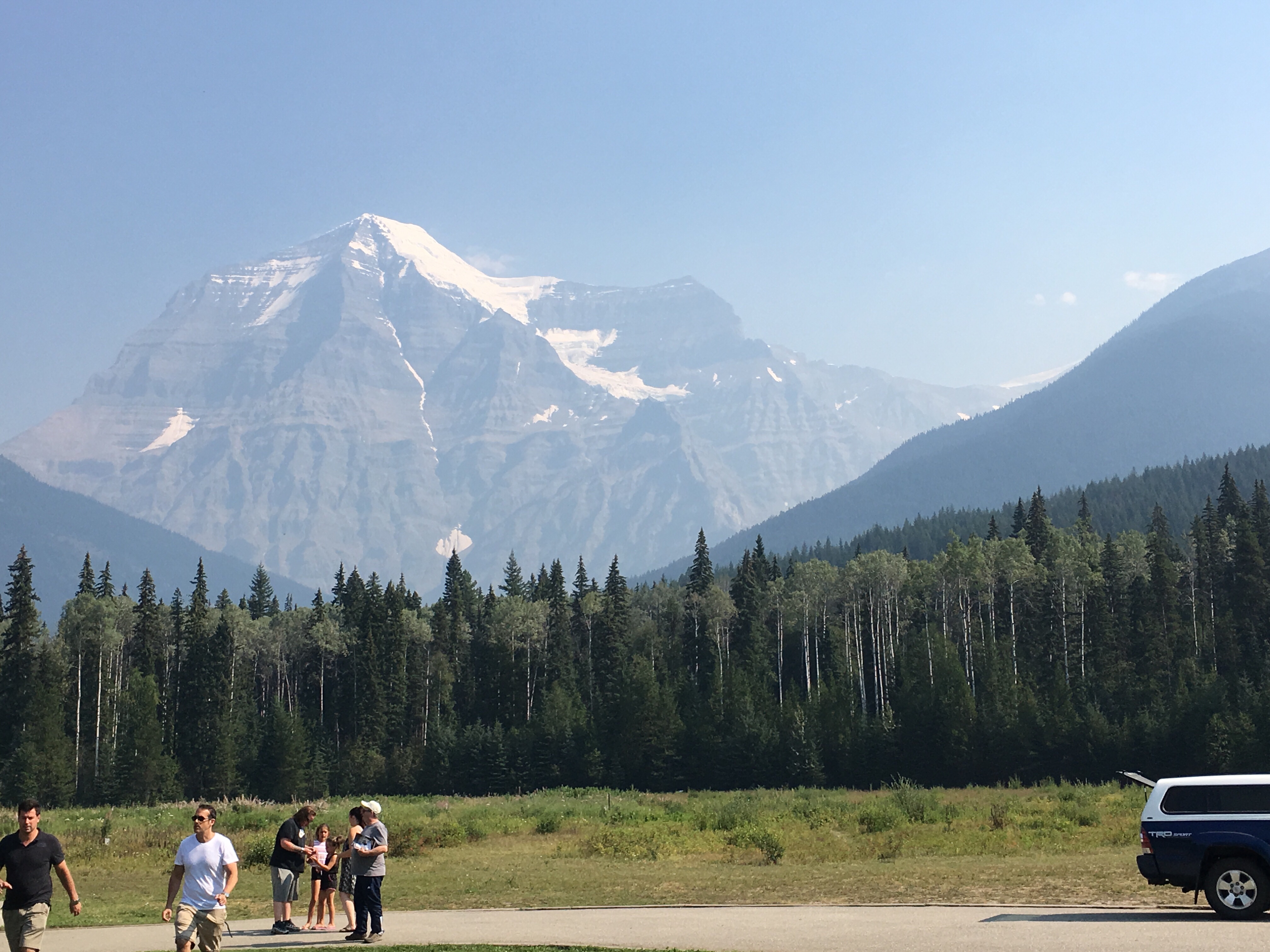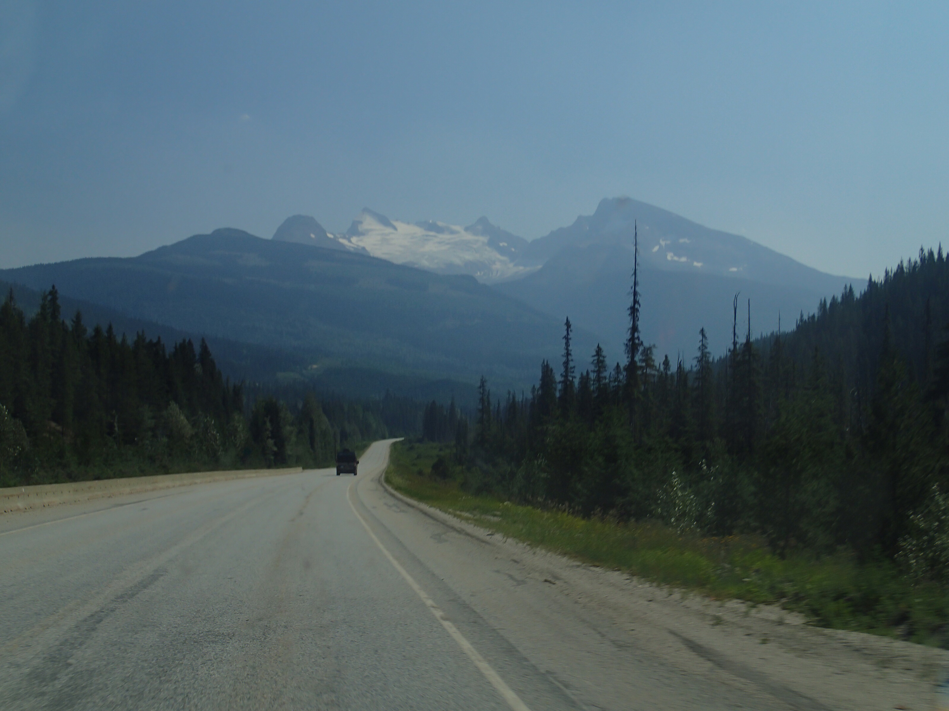 Dormis popir exception des trains qui ont passé pendant la nuit. On se fait notre café, on déjeune puis on décolle en direction du fameux « Parc National des Glaciers », où il y est répertorié pas moins de 430 Glaciers (le paradis) 🙃. On sait que ce sera beaucoup de route mais faut ce qu’il faut. En chemin en refaisant l’itinéraire 2-3h semble s’avoir ajouter! 😲. Ha!, il nous font faire un méchant détour car la « route 1, la transcanadienne, est fermée pour collision avant Revelstoke et pas sûr de s’y rendre non plus car beaucoup de feux de forêt, cela dépendra des vents. Donc arrêt à l’info centre de Pemberton: pas de routes fermées pour les feux car les vents ont changés de bord 🙂 mais l’accident, on ne sait pas combien de temps il fermeront😕! Étant à 6h de route de là, on verra bien en chemin, on pense qu’on devrait être Ok! C’est repartis, encore une fois la route panoramique est de toute beauté, dommage pour la fumée qui nous empêche de voir au loin.
