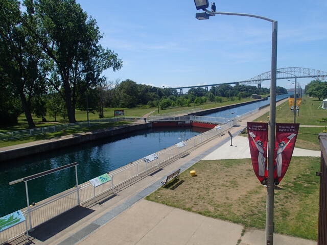Sault Ste-Marie avec vue à droite des USA et a gauche Canada