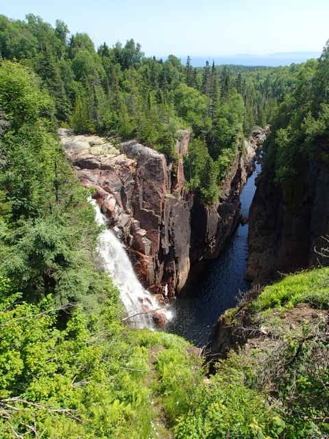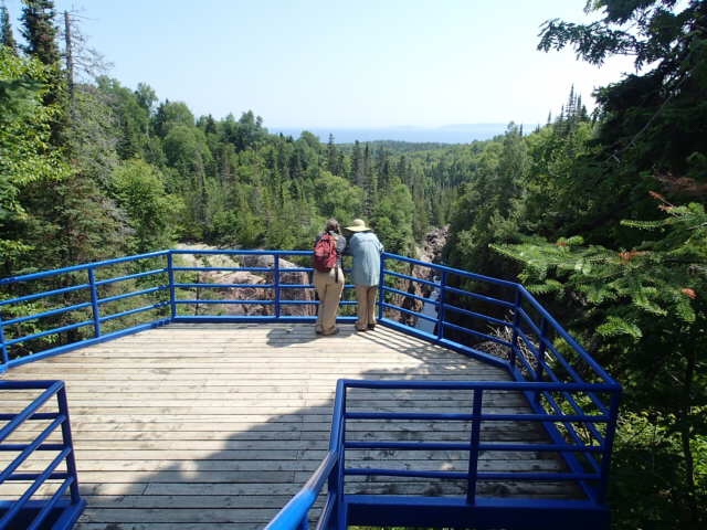On arrête dîner a Terrace Bay où on voit un canyon avec une chute d’eau s’y déversant. Tres beau! Oups scotch on profite pour faire un « poupou » sur la passerelle!