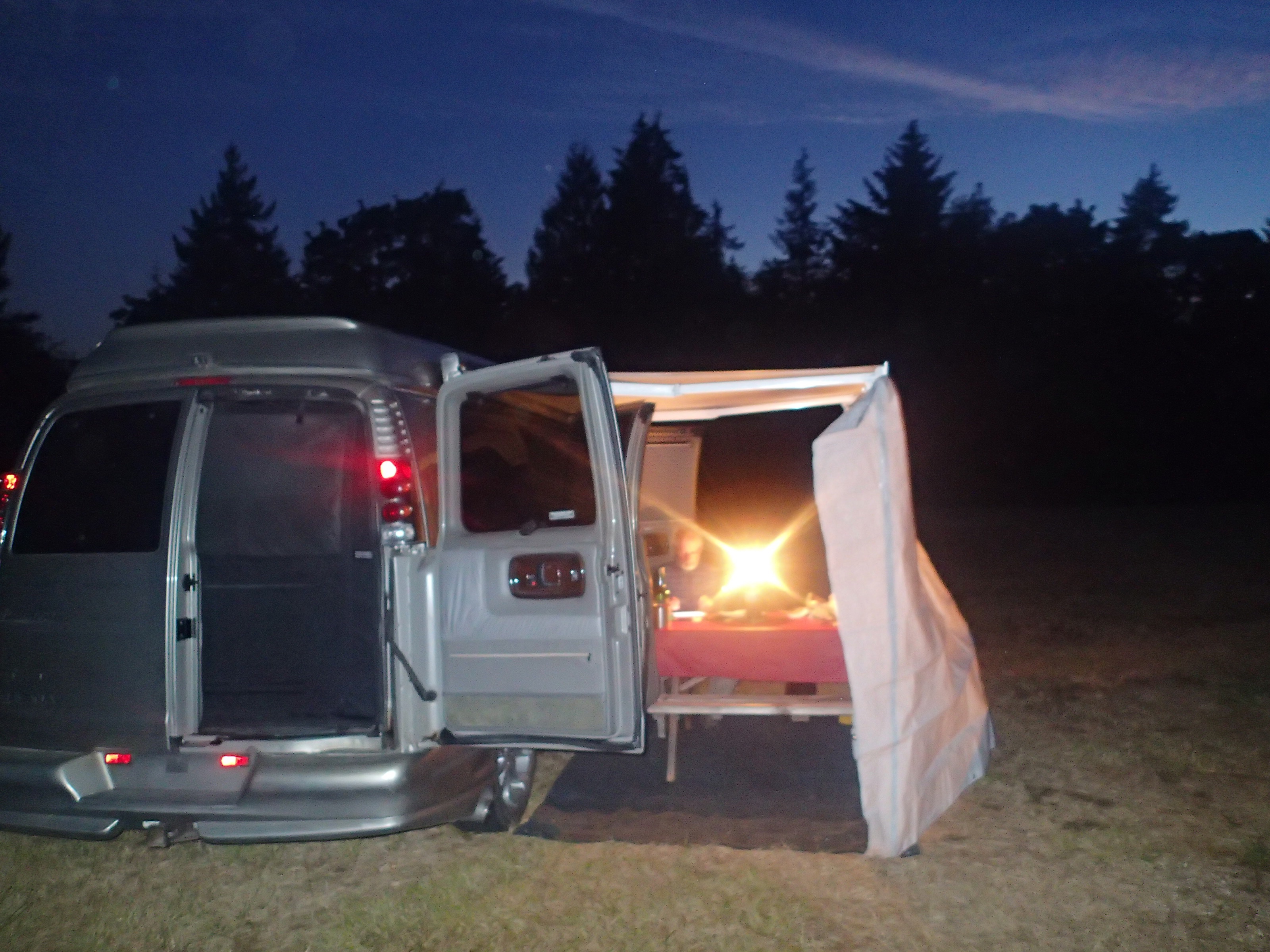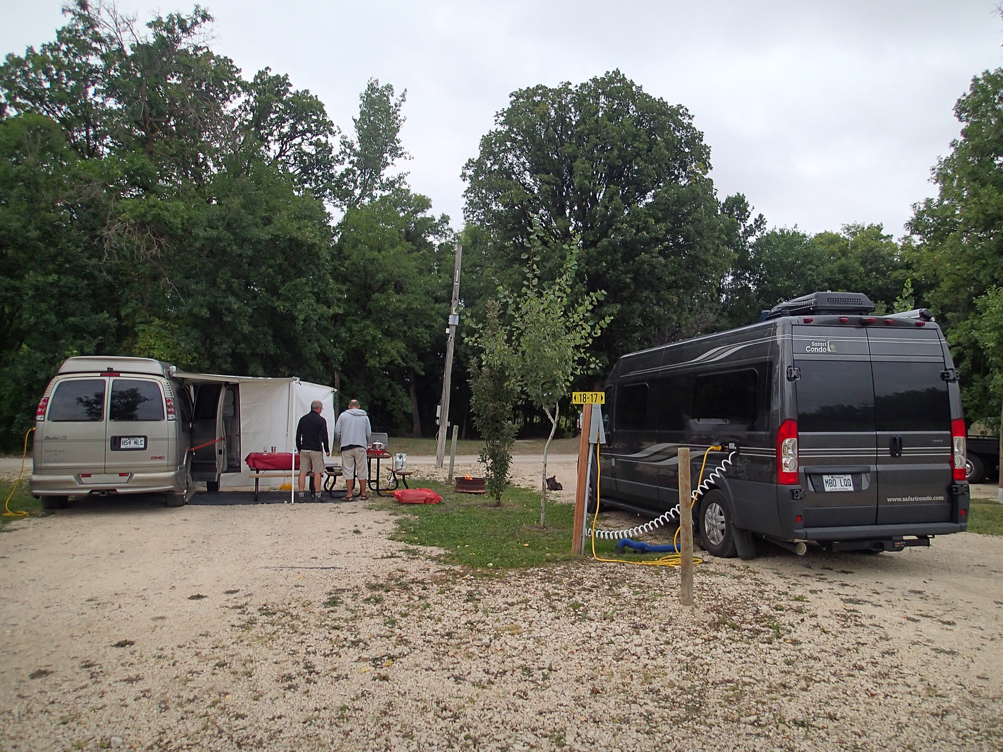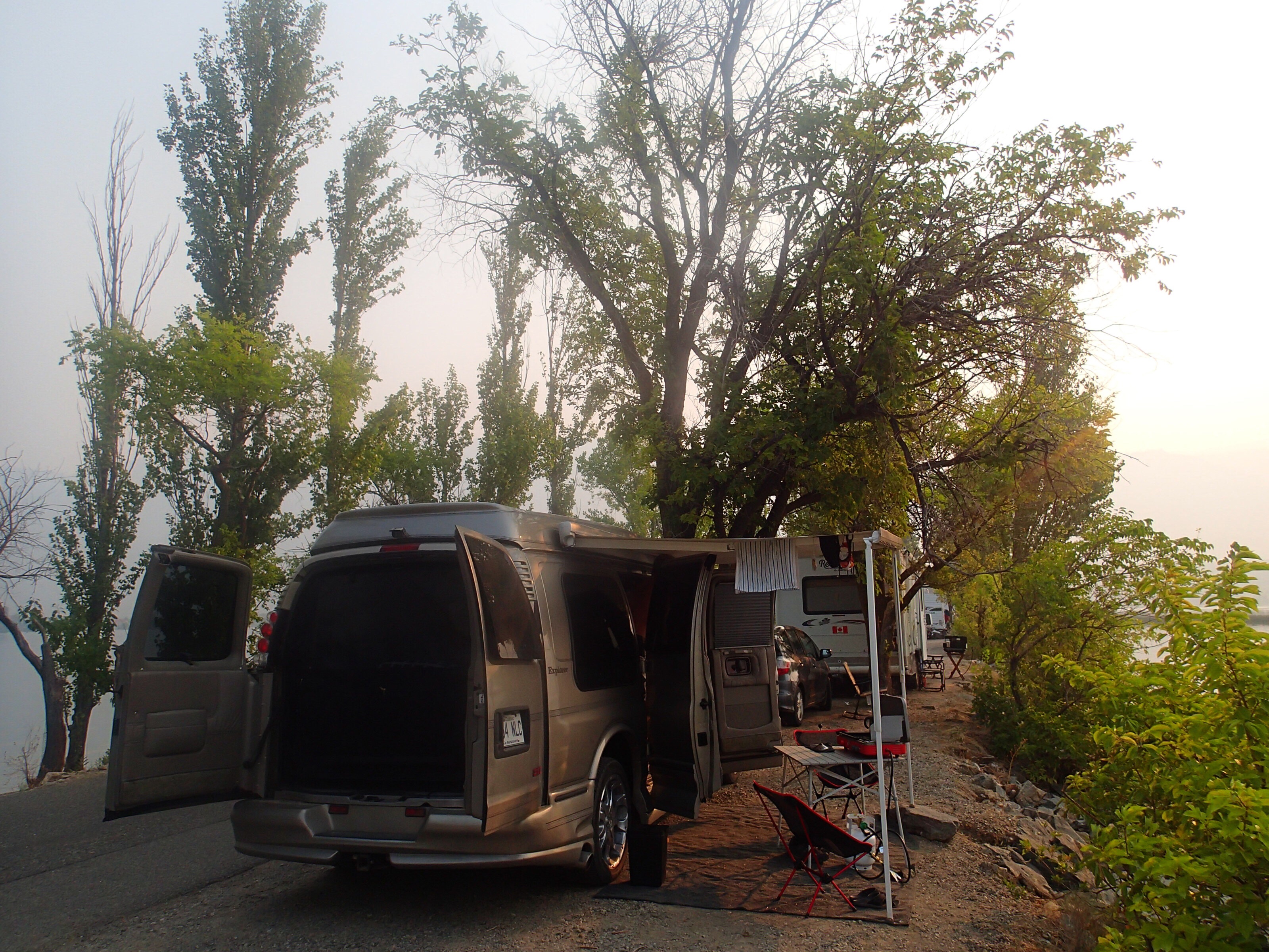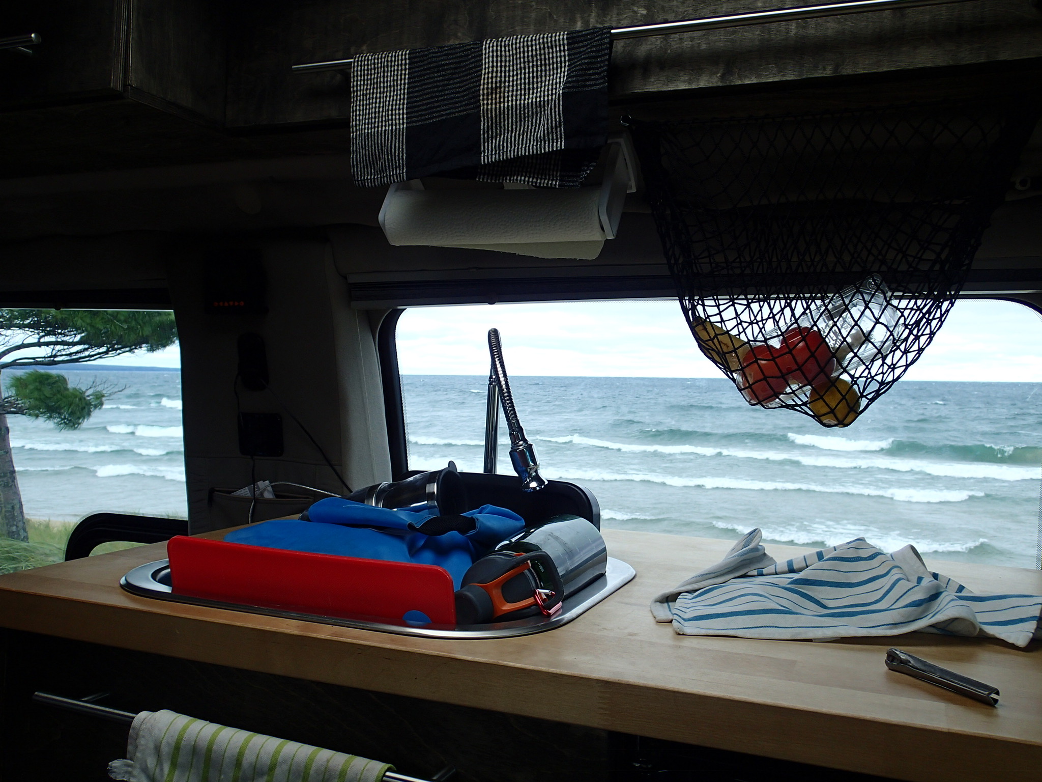 Puis le côté pratique c’était comment? Dans le « day to day/ le quotidien »…bon au début ça un peu crispé: genre Nath (moi) faisait la germaine de l’intérieure…oui oui je l’avoue: c’est que j’ai un côté organisation très fort, chaque chose à sa place et surtout je réorganise tout le temps (ha! ha!)…et ça m’a fait beaucoup de bien quand Johanne est arrivé avec Claude …car les vacances a Claude était terminé (ha! ha!) Bon mais pour vrai: c’était pas mal, c’est sur que c’est le genre de VR pour vivre dehors plus tot qu’en dedans…donc ça allait pour nous mais c’est vrai que quand il fait froid, bien il faut bien s’habiller et s’il vente très fort et bien là on va entrer à l’intérieur et cuisiner en dedans. Là c’est un peu plus limité…genre une personne fait les choses car on peut difficilement bouger 2 à la fois. Mais on échange les rôles pour la fois d’après! Mettons que dans la van de Claude et Johanne c’est un peu plus spacieux que la nôtre….mais c’est toujours bien mieux qu’en tente! Surtout s’il pleut.