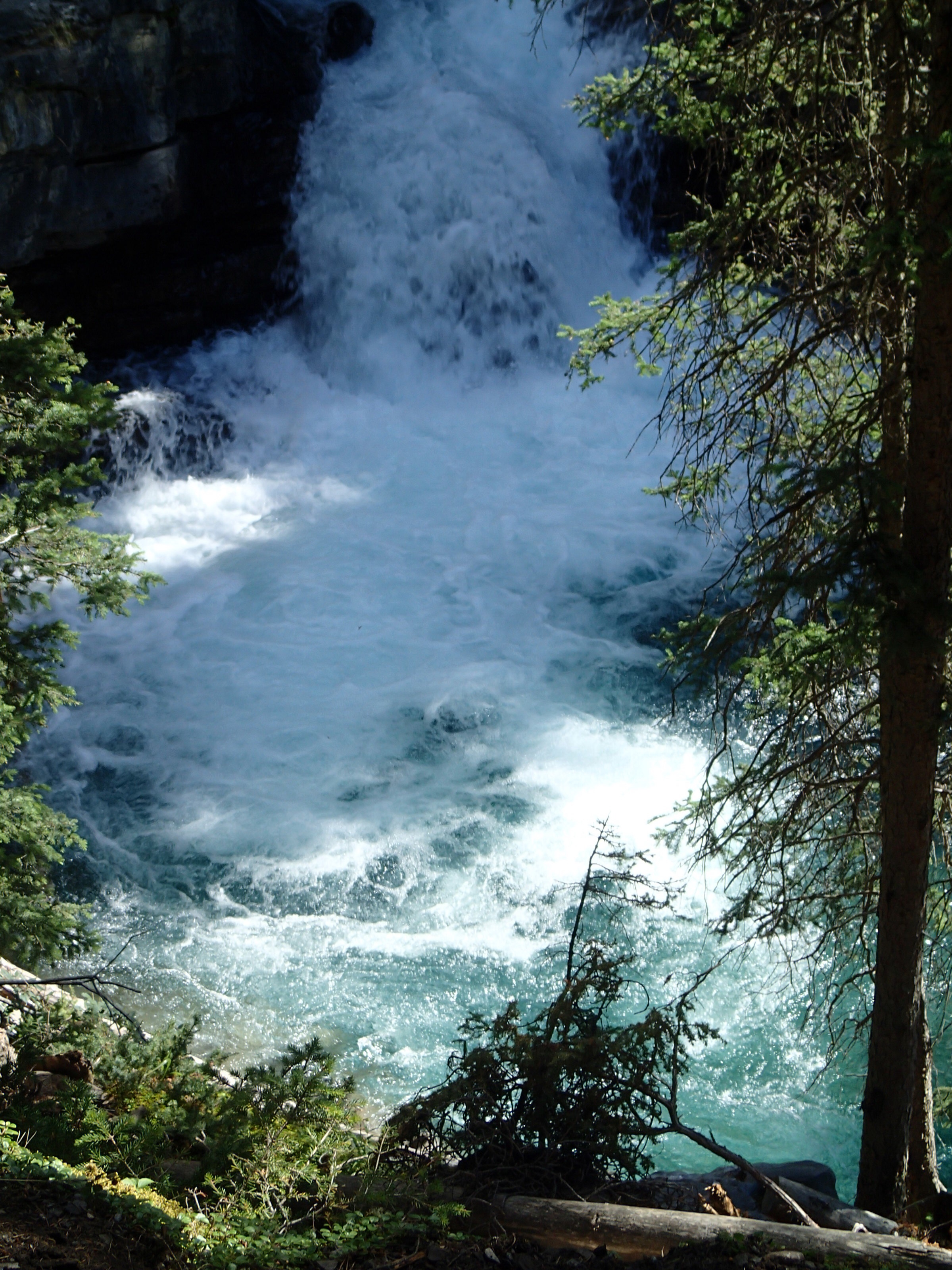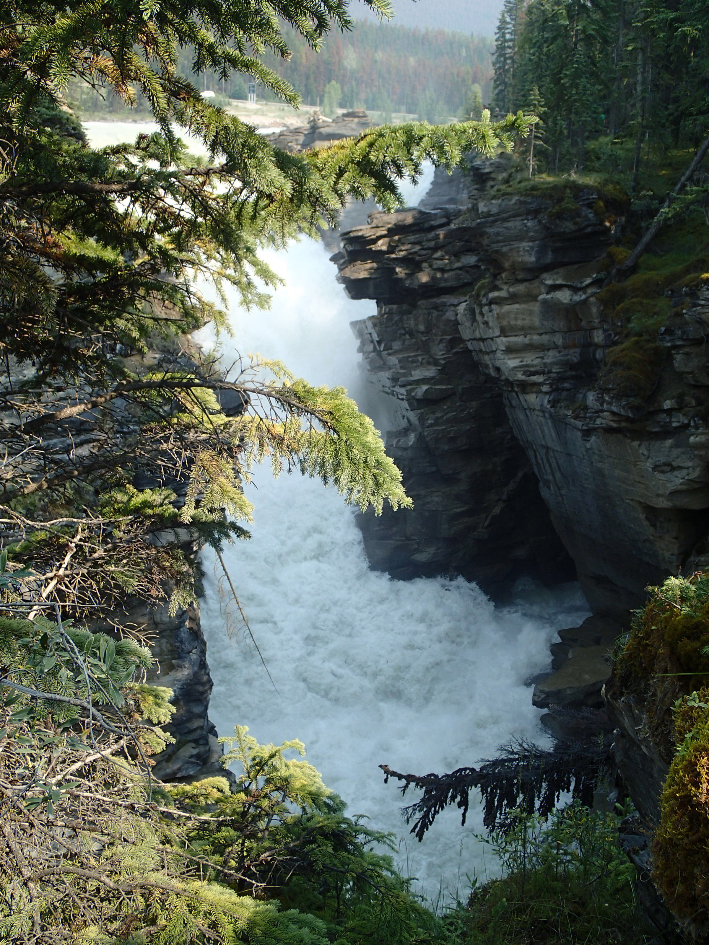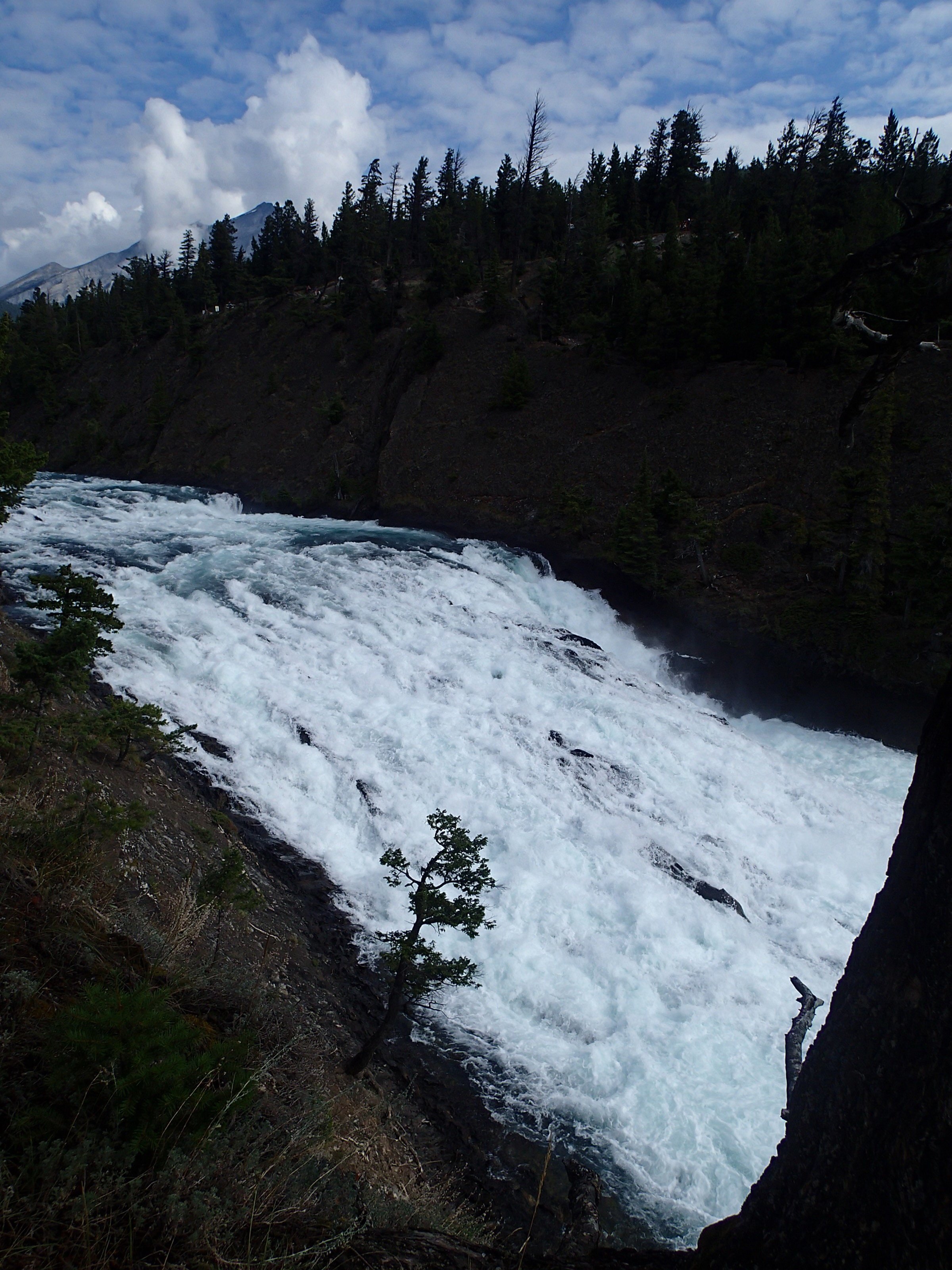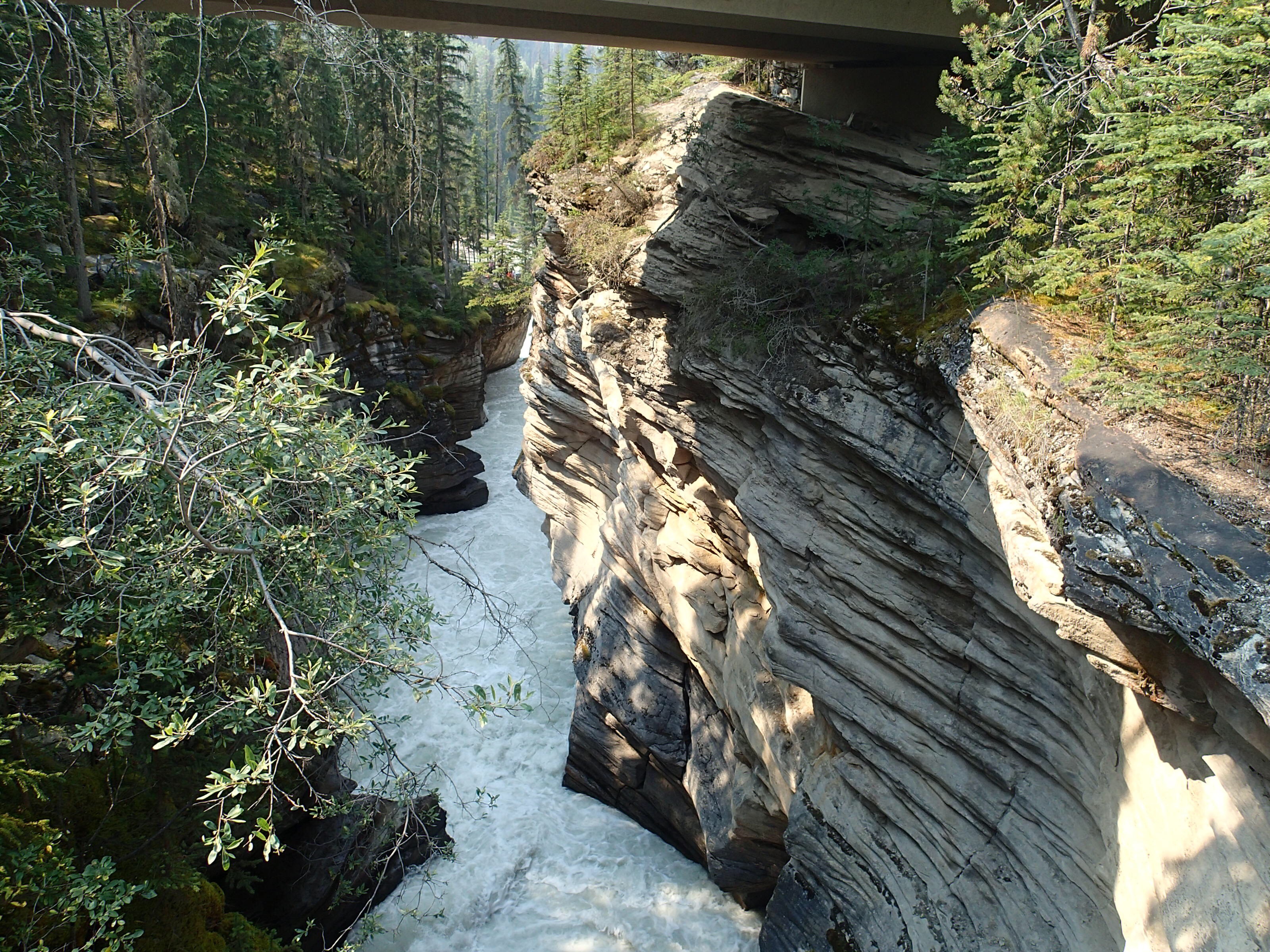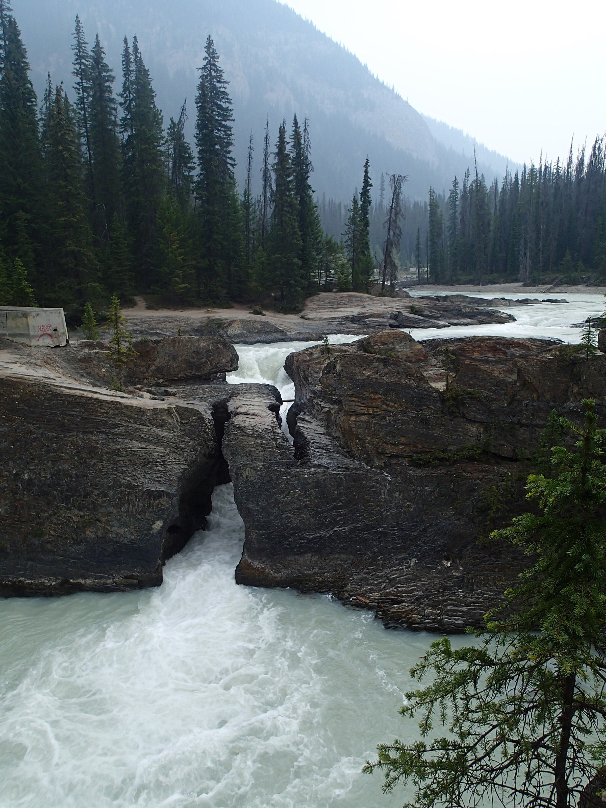 Donc on décide de continuer vers le Parc National de Yoho qui est supposé aussi être un autre joyau selon le Lonely. Un attrait touristique est indiqué sur le chemin: natural bridge (non indiqué dans mon livre!). On décide d’y aller. Wow l’eau c’est creusé un chemin à travers la roche laissant la possibilité de passé sur le dessus en passant sur le mur de roche…mais d’ici quelques temps (???), une partie s’effondrera pour laisser place à une gorge profonde. Une chance qu’on c’est arrêté!