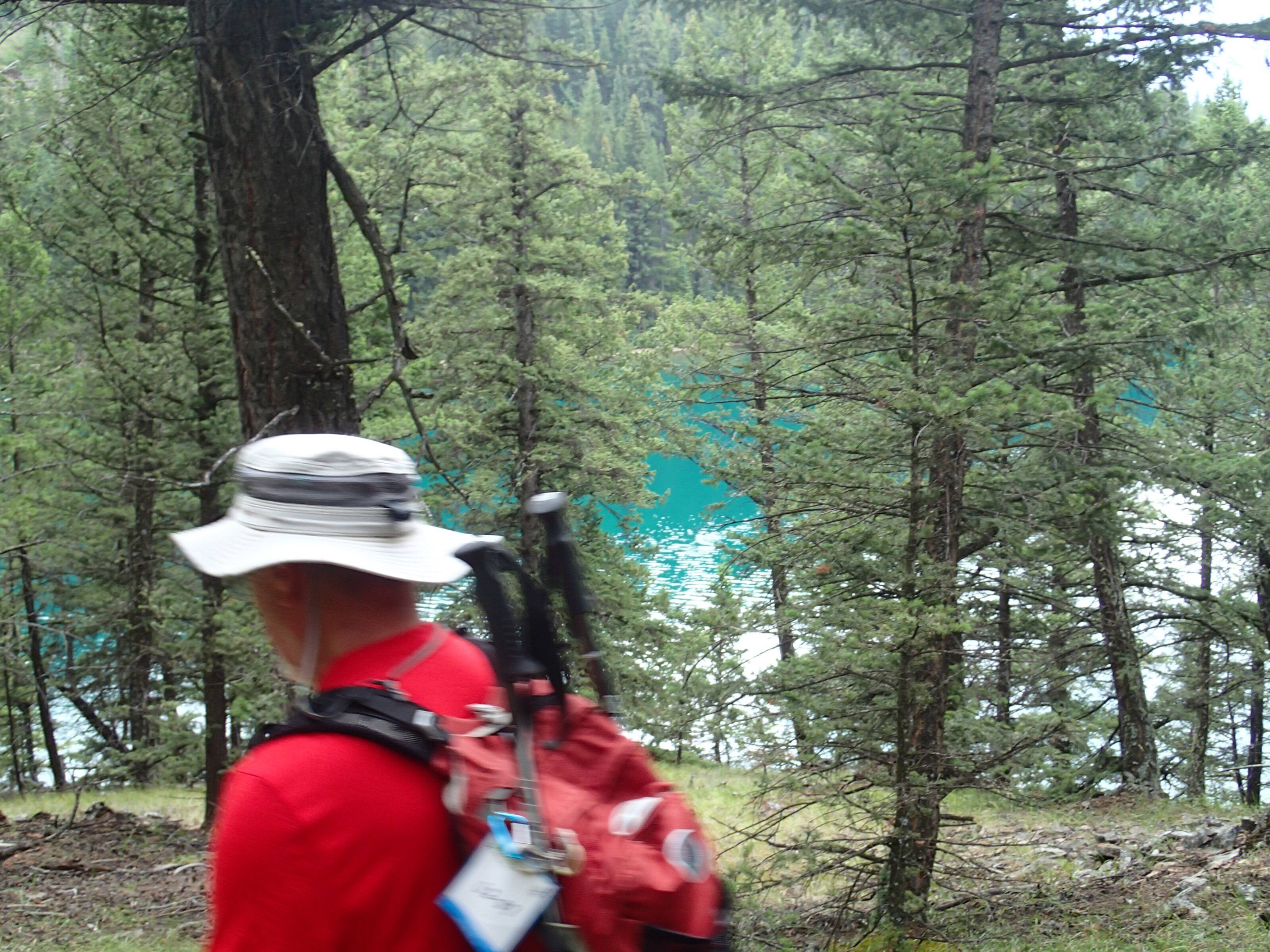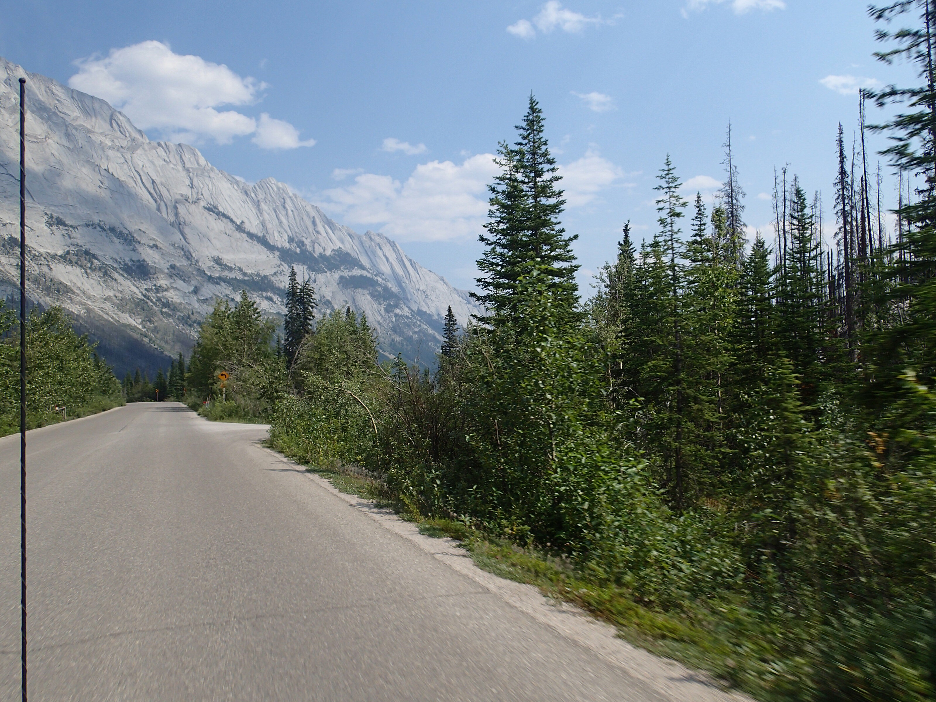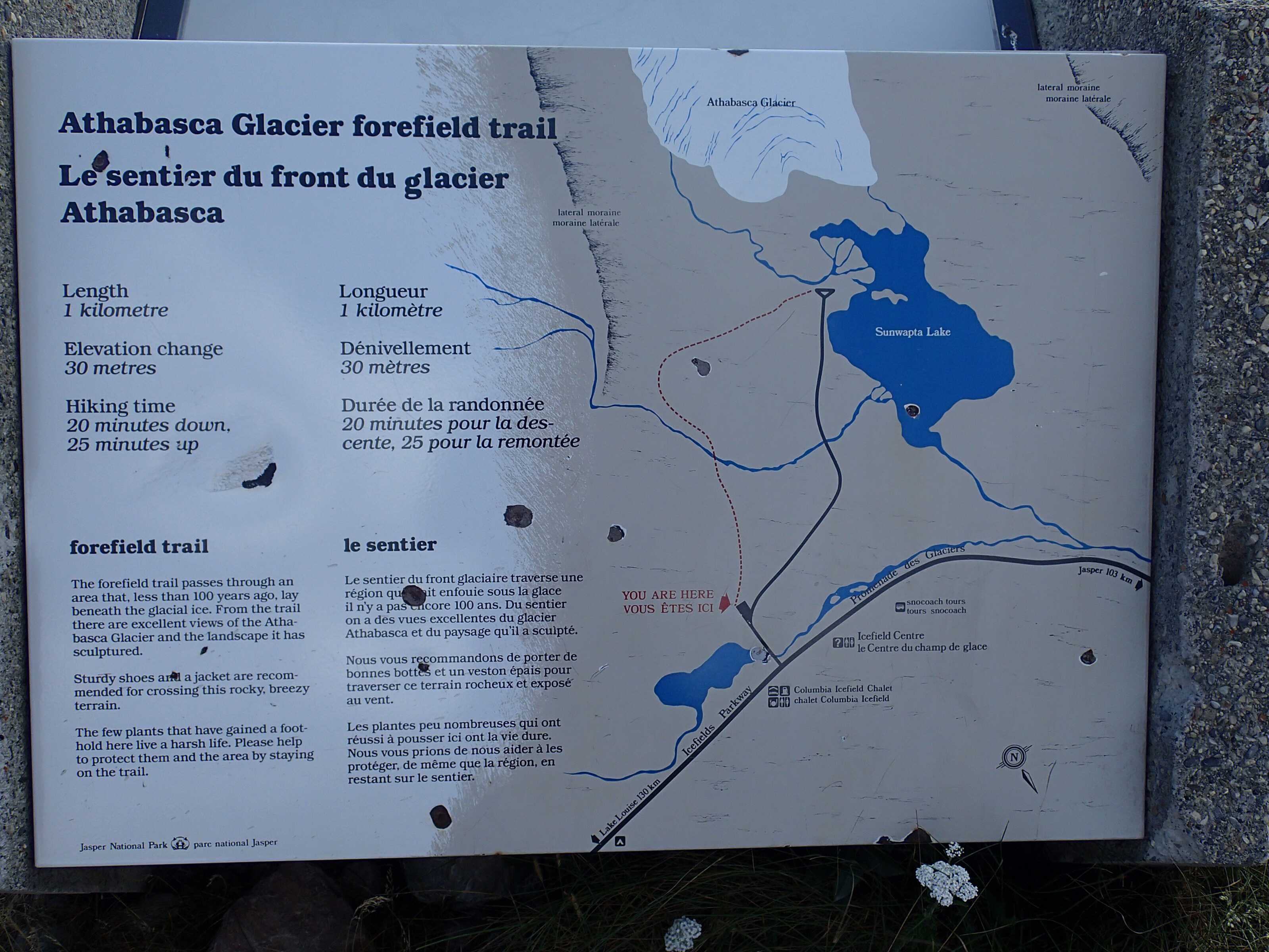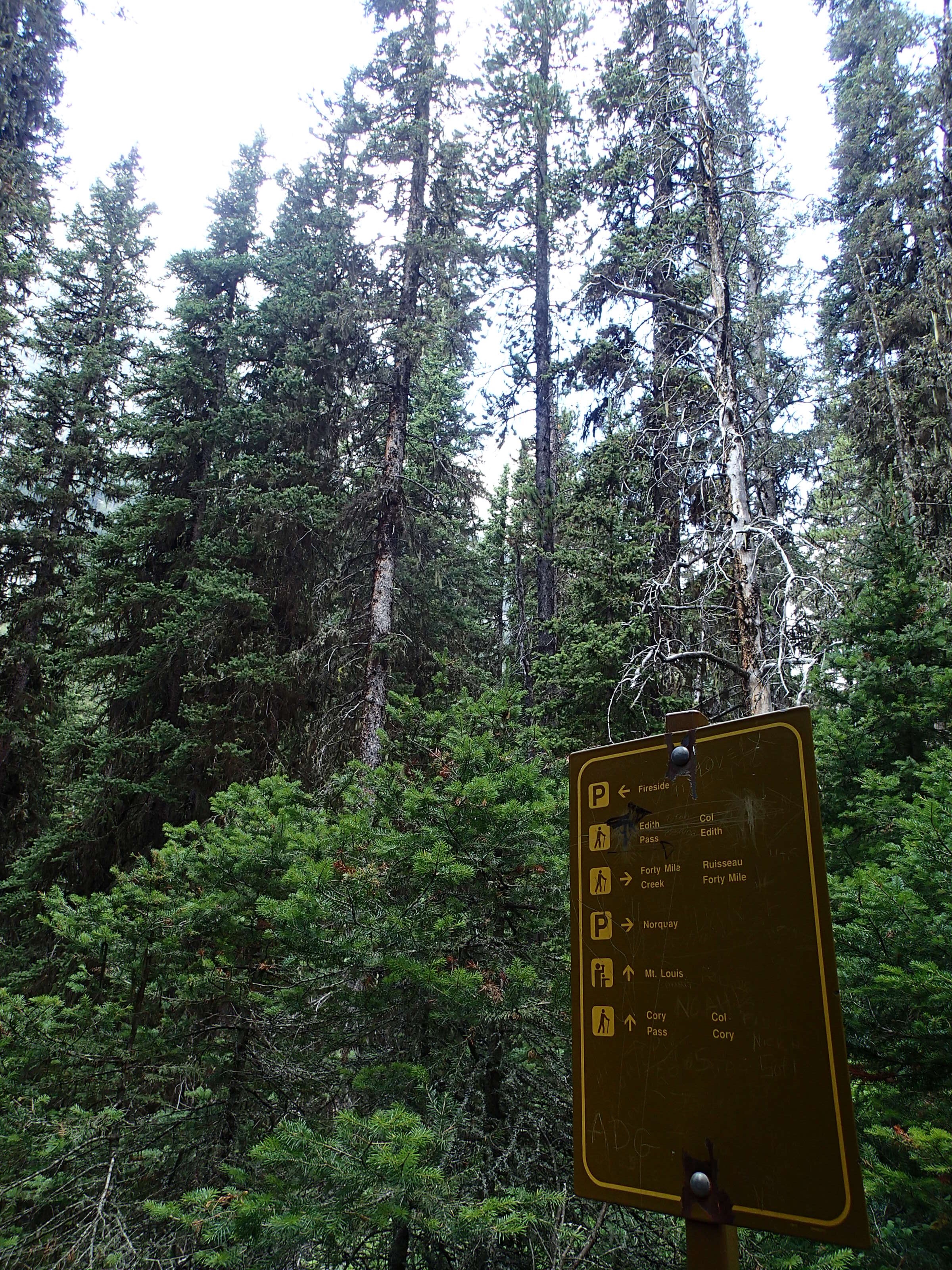 Ben non, on voit une indication pour une randonnée. On arrête, on enfile bottes et on part. 4.9 km pour voir le Col Edith! Ok…et bien on marche et marche, pis on a oublié de s’amener de l’eau… perdu l’habitude. Nath en arrache comme jamais car toute congestionnée au sinus depuis quelque jours. On voit des pancartes mais aucune indication des km restant. On voit du bois et du bois. Après un moment et beaucoup de monter (600m)., on voit une autre pancarte…eeeeeh des flèches sont indiqués pour les autres cols plus loin mais celui que nous avons choisi le moins loin …Ben pas de flèche! A gauche ou à droite!🤔🤔 bon ont choisi le point d’observation tout droit mais aucune aucune distance. On fera un pas mal long moment pis on virera de bords. Tu parle d’une randonné de merd….!