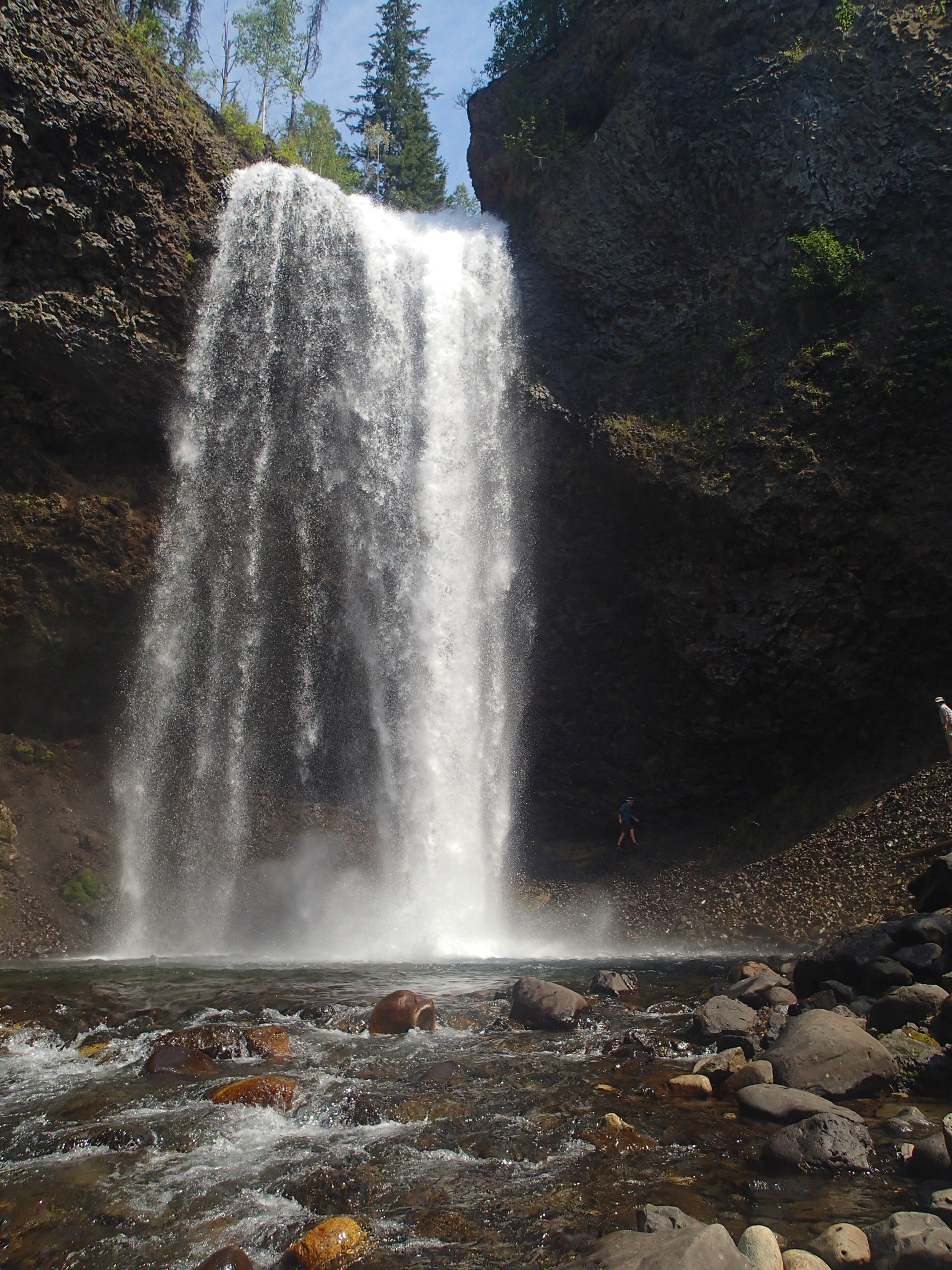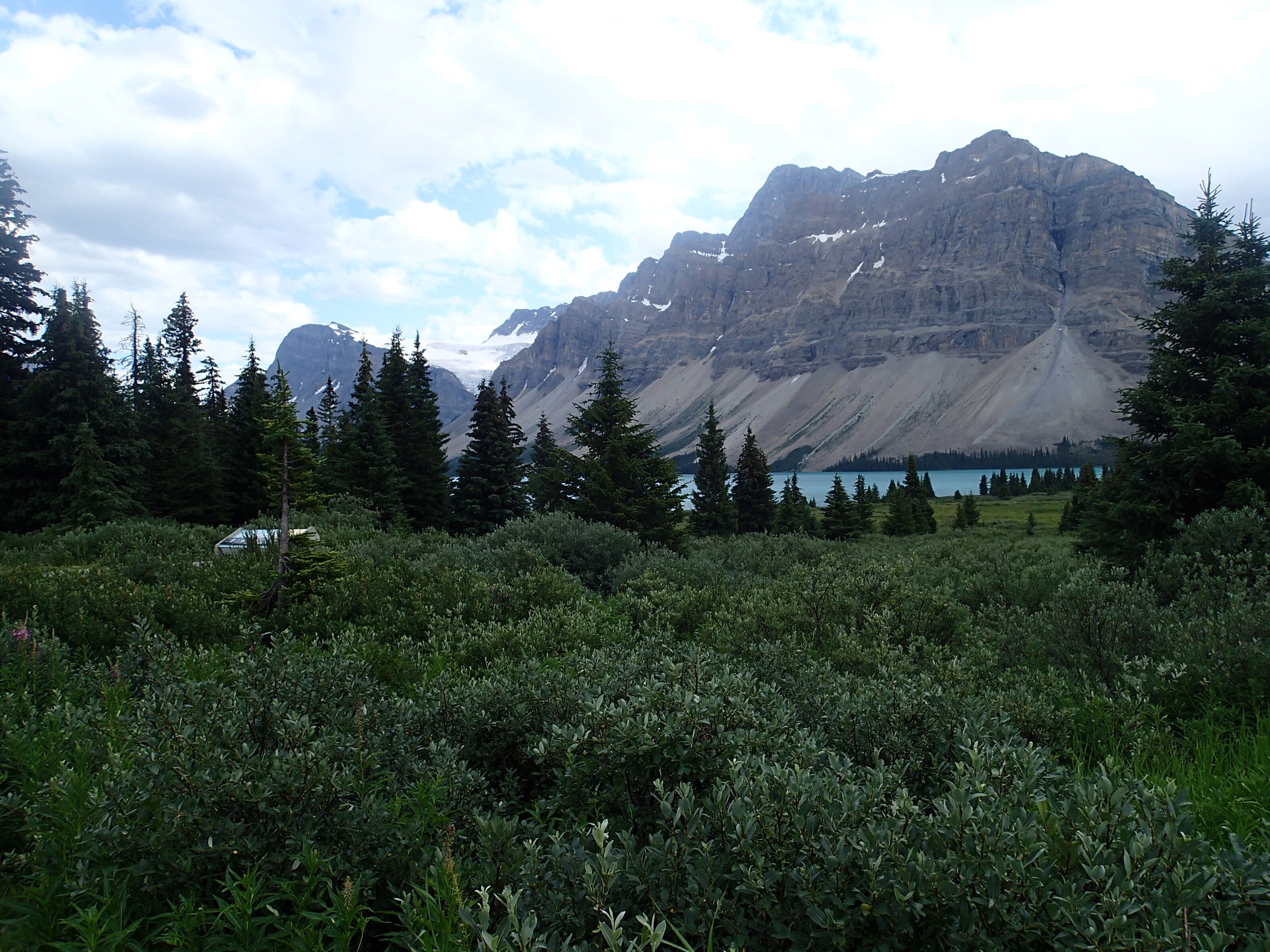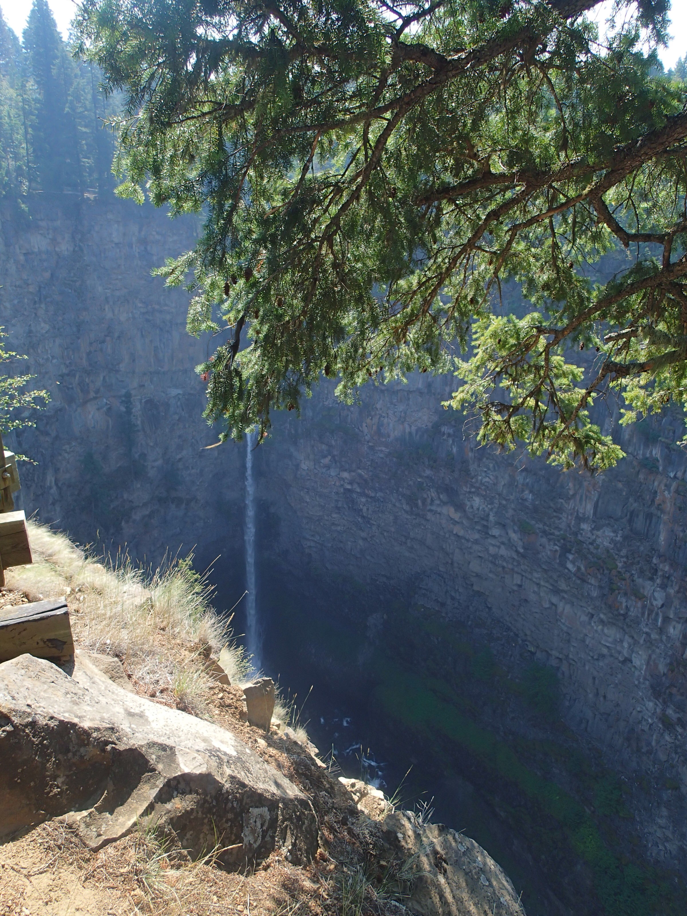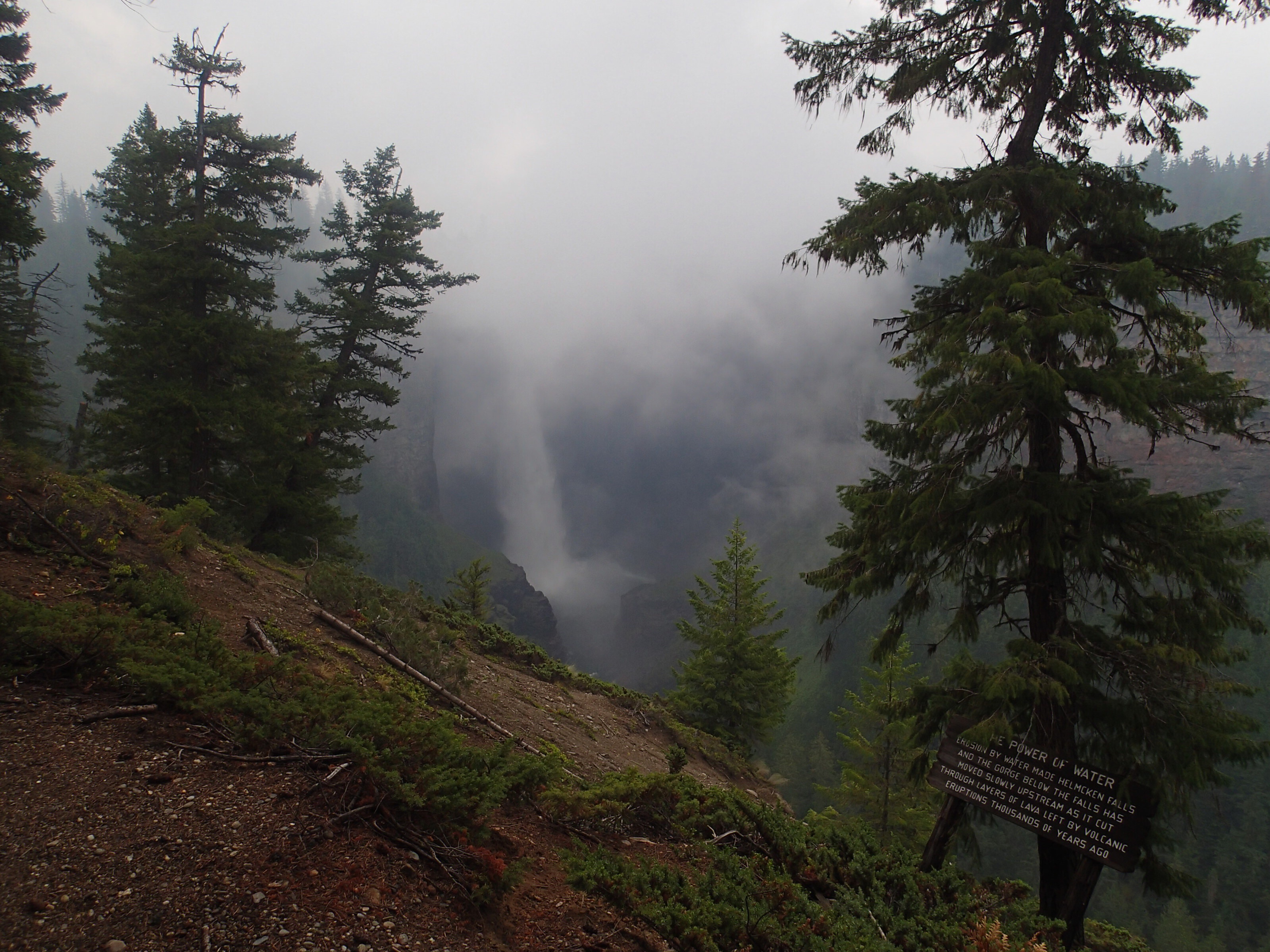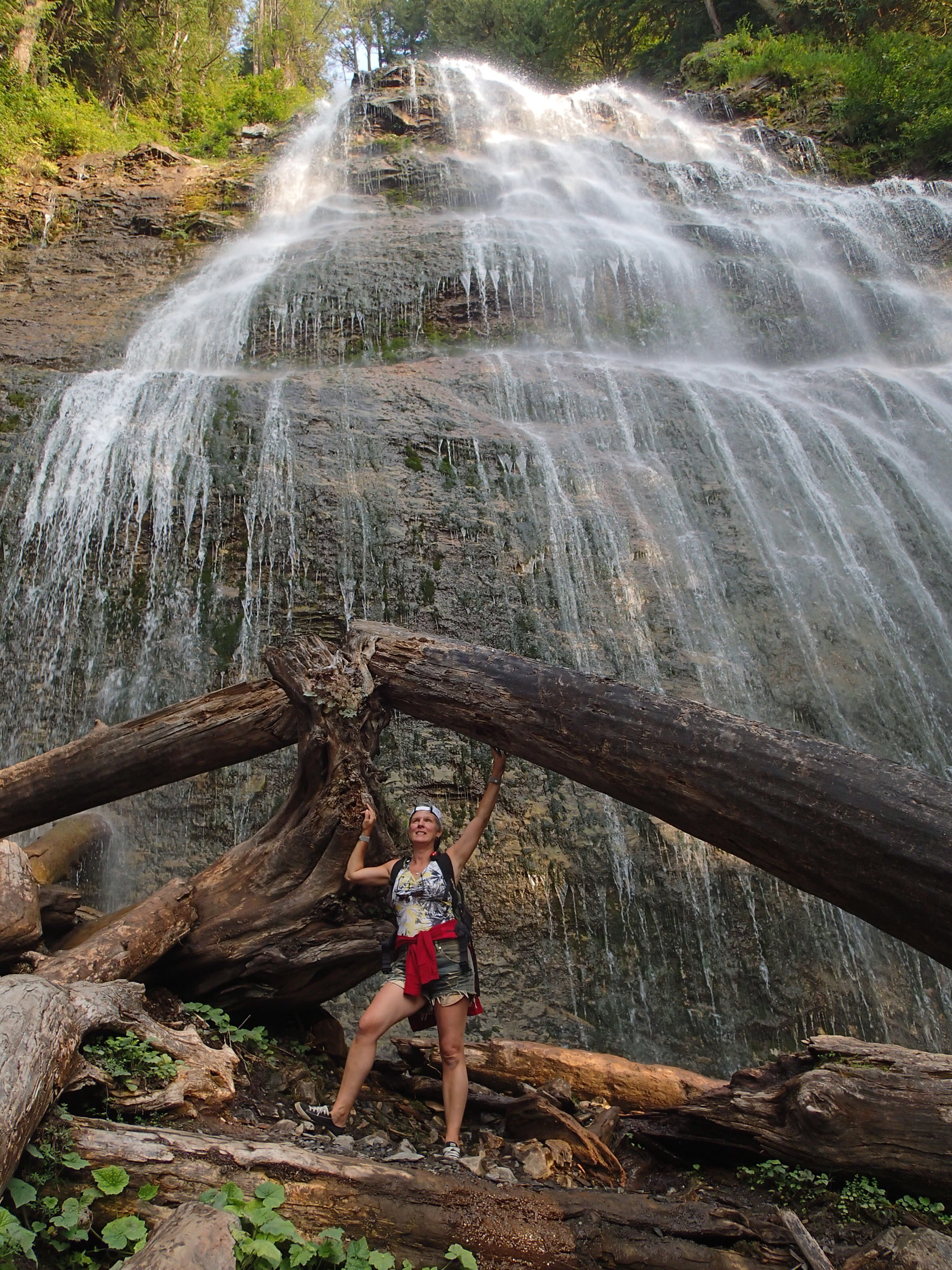 On reprends la route puis plus loin un autre attrait: Takakkaw Falls, la 2e plus haute chute au pays….255m. Ok on essaie même si on doit aller s’enfoncer 12km dans le bois. Ha un campground…c’est plein! ( pas surprenant avec le retard causé par l’accident)…aller reprenant la Route du bois avec la van….oups ça monte pas mal et des virages en lacet dont un assez serré ( pas tout le monde qui peut passez ici). En temps normal avec le beau temps cette route doit être magistral! On arrive on met les imperméables et allons au pied de la chute qui fait tout un vacarme! Très beau et puis on essaie d’apercevoir tant bien que mal les sommets avec une lueur de glacier…