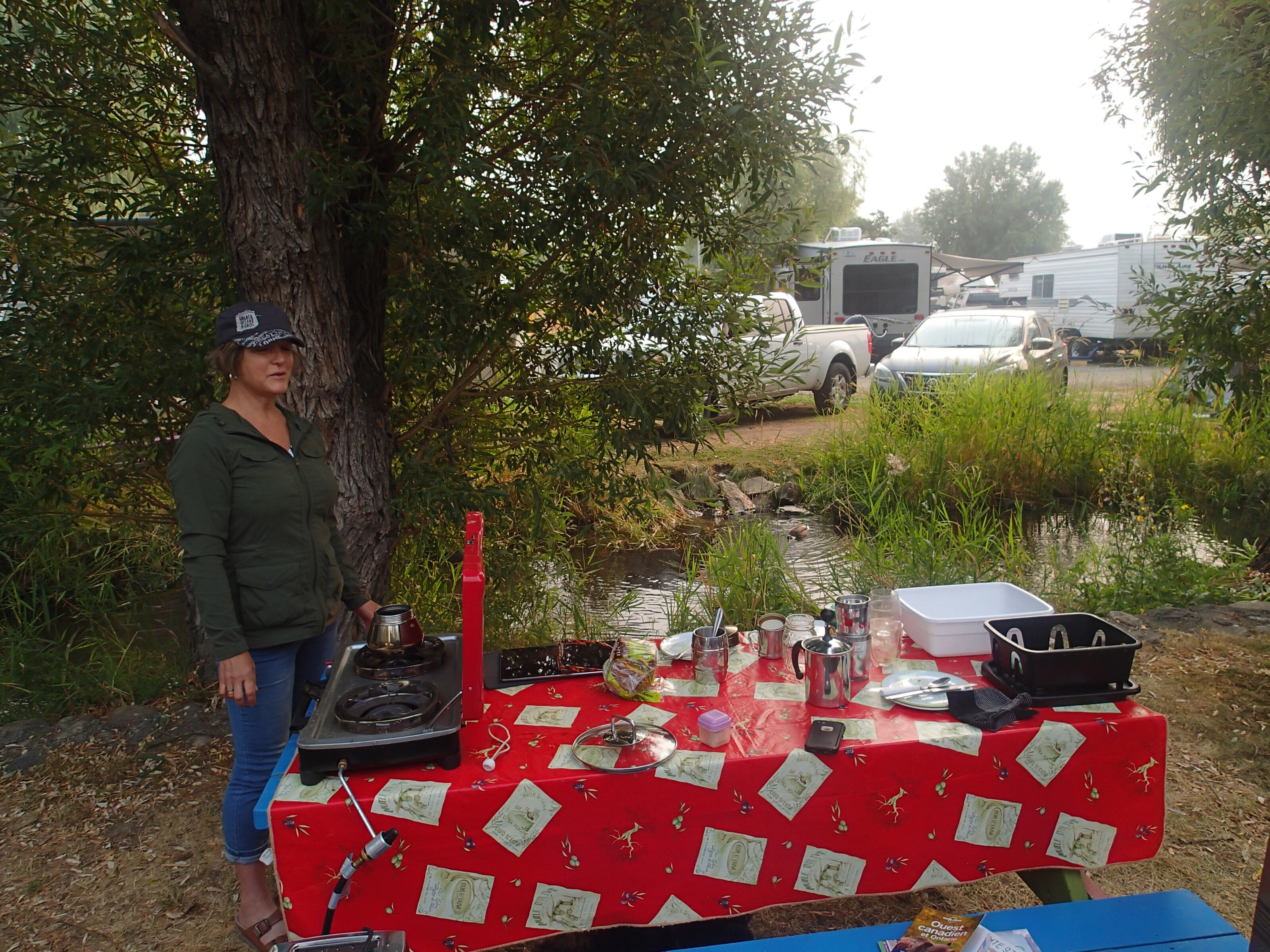 Bon tant pis pour Whistler car on préfère avancer sur notre route et on opte pour Nairn Fall provincial park, après plusieurs minutes à tenter de les rejoindre pour réserver un site on décide d’y aller et tenter notre chance. C’est un « first come, first serve ». Yéé😁 il reste un site dispo. Ce site est magnifique accolé à une rivière couleur jade avec les montagnes juste aux dessus avec quelques parcelle de neige! Wow! On jase un peu avec le responsable du parc car on a certaines inquiétudes à propos des fermetures de routes potentielles dues au feux de forêt dans la région, il nous recommande de valider au centres d’information demain sur notre route. Il est tard, se sera « ribs de porc » (déjà apprêter et cuites) et salade pour souper. Petit 🍷🍷 pour accompagner le tout et voilà un souper presque parfait. Un peu d’écriture et hop dodo.