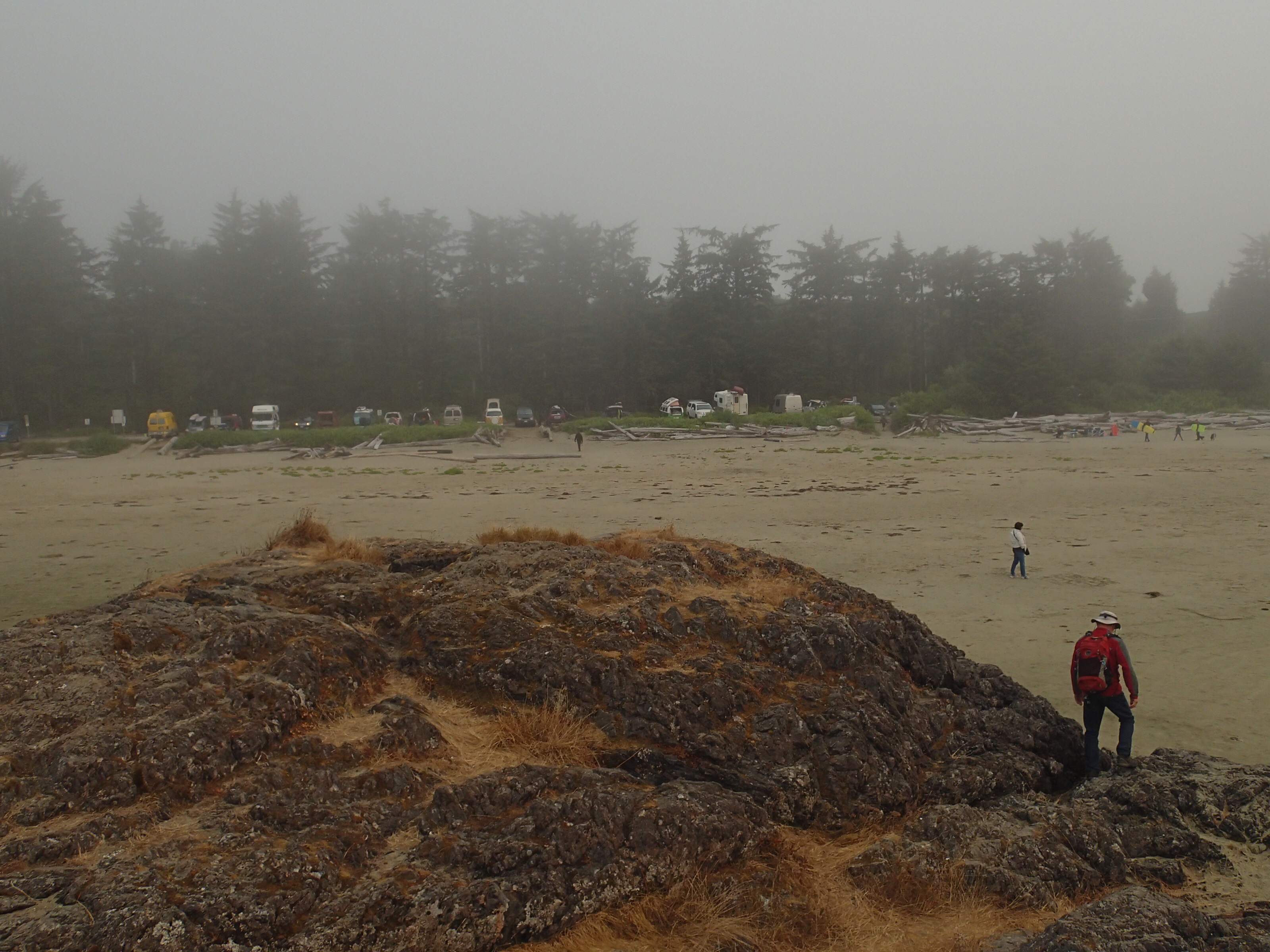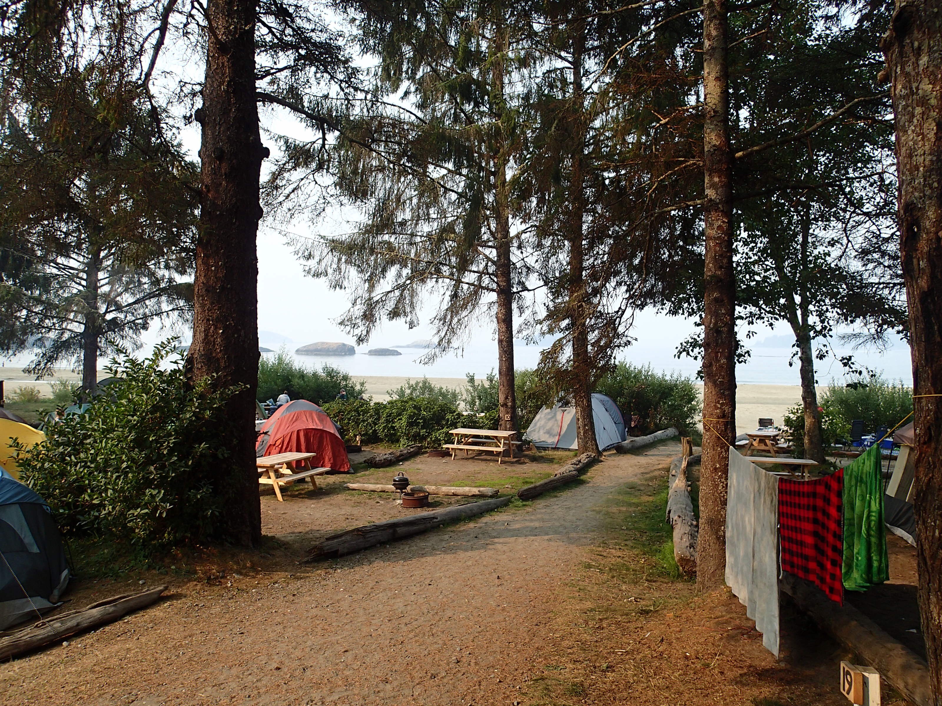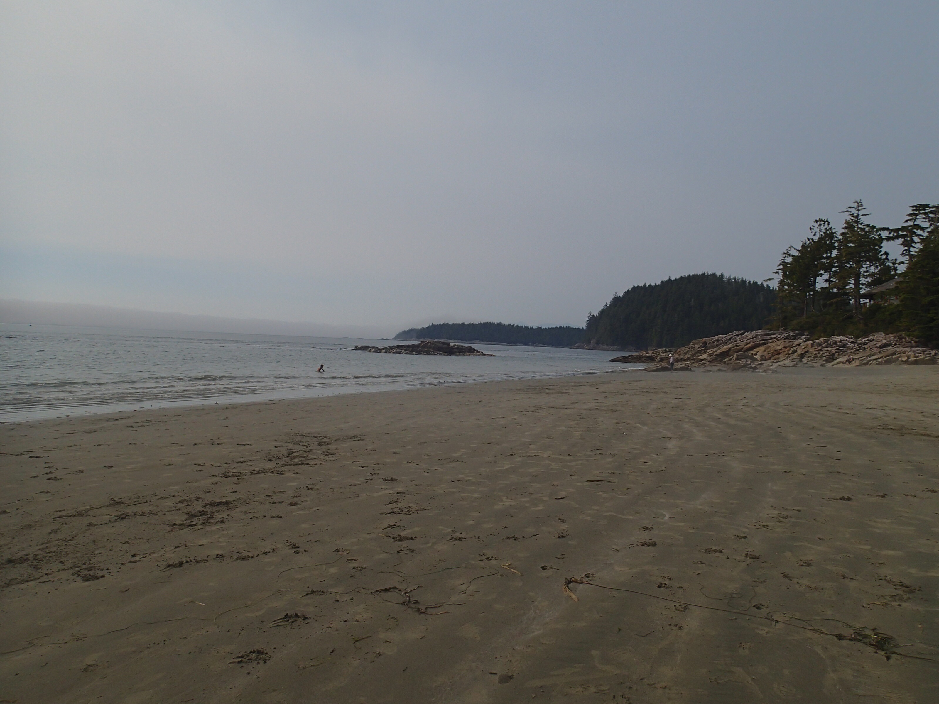 Retour au VR et on cherche un endroit pour dîner, les plages ici (Ucluelet) son Rocheuses et ne se prêtent pas vraiment à la faillante. Nous décidons donc de retourner vers le parc du Pacifique RIM (qui se trouve entre Tofino et Ucluelet) à la plage Florencia pour dîner. Petit lunch vite fait et hop sur la plage avec notre costume de bain (au cas) pour marcher les pieds dans l’eau (pas plus car ben trop frette!!,). Malgré l’eau à environ 54 degrés on a vue 2-3 personnes y aller sans “wet suit”!! Donc on aura été trop “poule mouillée” pour se jeter dans l’océan Pacifique! 😞