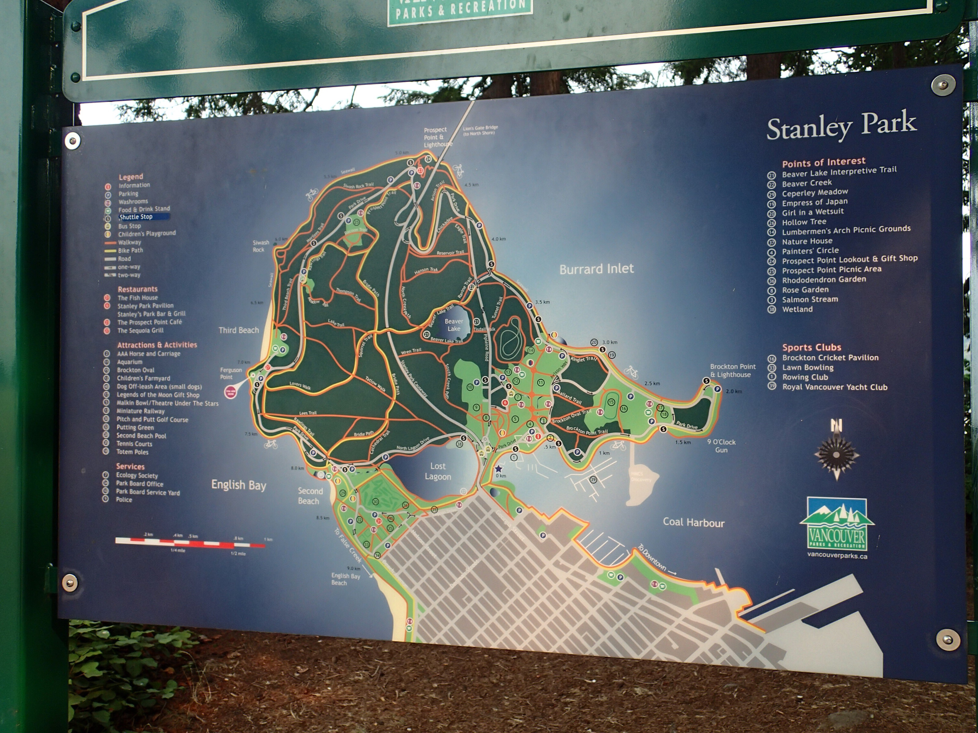 En entrant dans la ville de Vancouver, immédiatement le gigantesque Stanley Park (similaire à l’île Sté-Helene de par sa position). On y fait arrêt pour faire des téléphones où on essais de trouver un dealer GMC pour réparer le sensor mais sans succès. La bonne nouvelle est qu’il n’y a aucun danger ou urgence à le faire réparer, selon un des mécaniciens, si le véhicule n’a aucun symptôme de problème, ce qui est notre cas. Donc magnifique parc situé sur la pointe de la ville et une chance qu’on y a fait arrêt très tôt car déjà les gens arrivent en masse. On trouve du stationnement à cette heure sans problème et on utilise une application avec le cellulaire pour ajouter du temps comme on en veut ( pratique! 😉) L’environnement est superbe: magnifique forêt de Cyprès et Sapin Douglas en plus de multitudes de sentiers pour randonneurs, vélo, cyclistes et même patin alignés! On passera plusieurs heures à se promener et visiter ce beau petit coin verdure au bout de la ville!