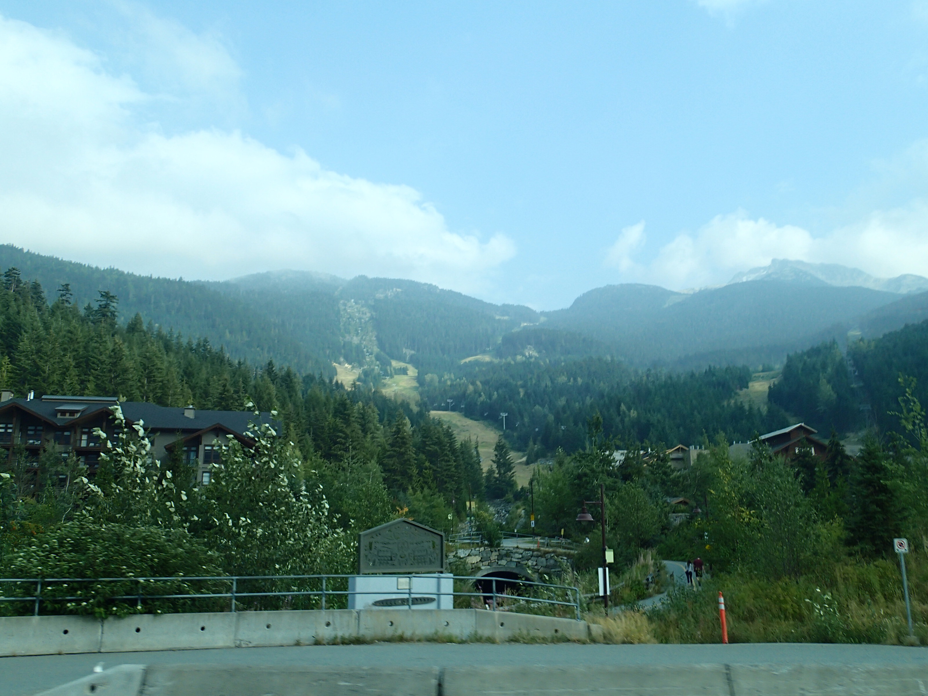 Bon on n’as pas vu le temps passé et les gardiens nous cherchent avant de fermer la guérite….juste à temps (on doit pas être les premiers à oublié l’heure!!). Sur le chemin du retour on voit un endroit (stationnement de piste de ski alpin) qui semble permettre au VR de passer la nuit, mais on se dit que ce serait bien d’aller voir Whistler et trouver quelque chose dans le coin. Dans le pire des cas on reviendra si on ne trouve rien. Arrêt à l’info dans le centre de Whistler pour voir les possibilités de campement, humm, rien et pas de Boonedocking permis nulle part. La ville ressemble un peu à Mont-Tremblant chez nous….On se rabat sur un camping privé à quelques KM, pas de chance, eux aussi sont plein. Ils nous donnent une liste de camping des environs.