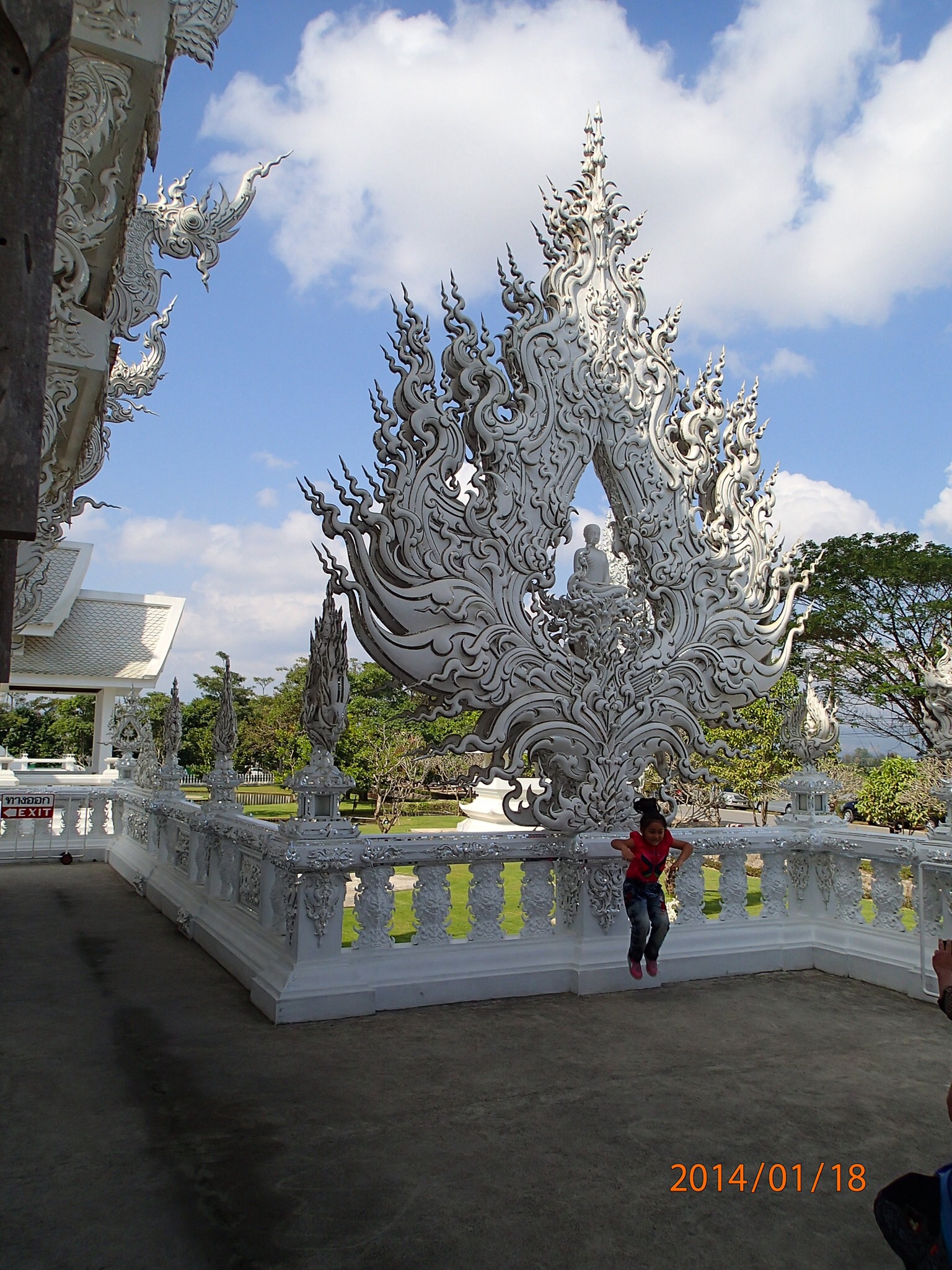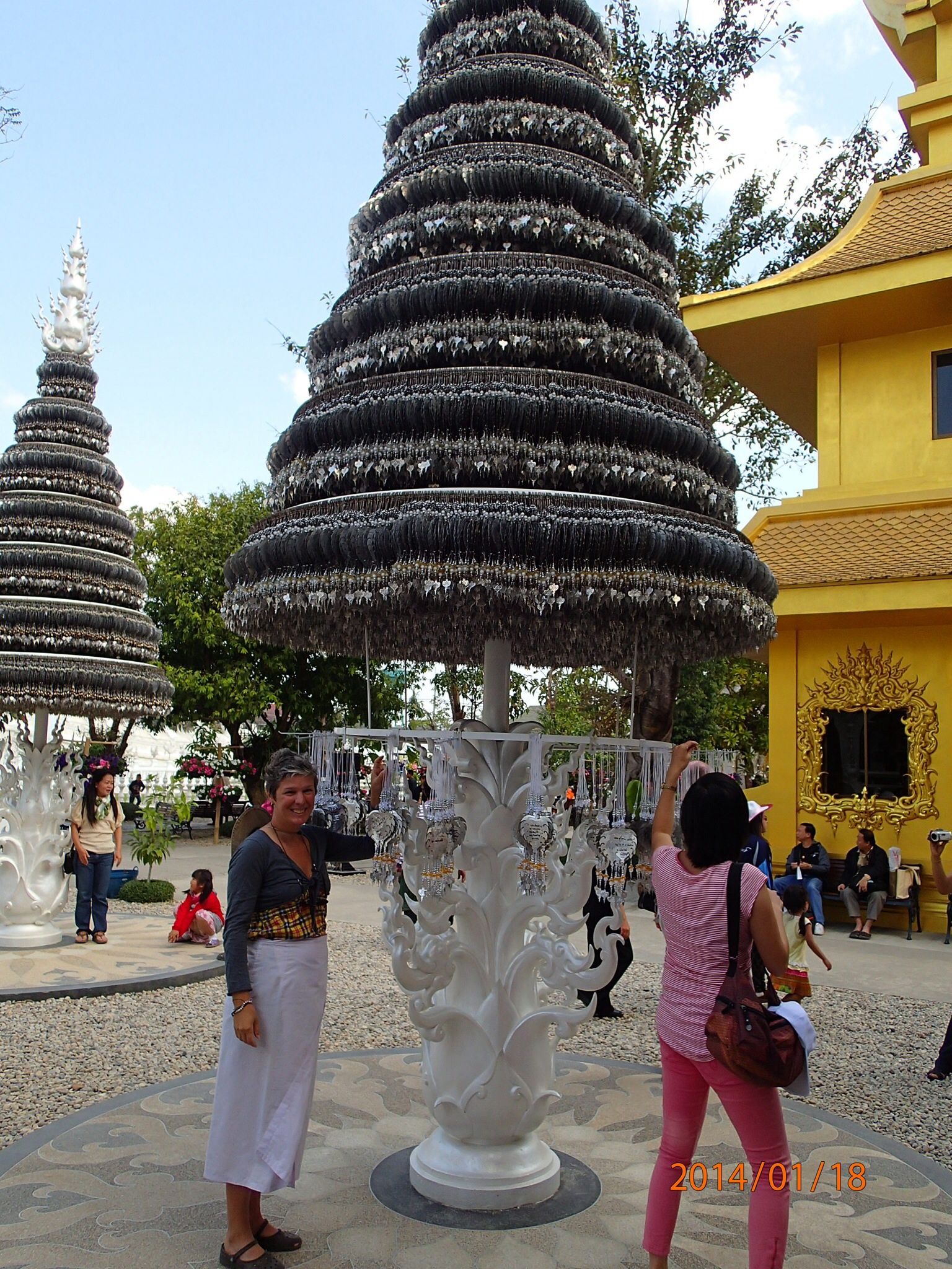 Arrivés à Mae Sai on aperçoit le pont frontalier donnant sur la Birmanie et la file de véhicules attendant de passer la douane, vrai ville frontalière avec une rue principale bondée de kiosques et boutiques. On spot un resto juste au bord de la rivière à coté du pont. Bon dîner typique: riz, poulet et Fried Spring rolls! Puis direction le triangle d’or, là ou les trois pays se rejoignent sur le Mekong i-e: le Laos, la Birmanie et la Thaïlande. Intéressant de voir cet emplacement extrêmement touristique (parait que ce n’est même pas le vrai emplacement car avant le triangle d’or était l’endroit où l’Opium se transigeait entre les pays). Ça vaut quand même