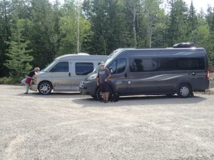 Un moment un jeune homme débarque de son camion ( Denis pense qu’on va se faire avertir). Et bien non, il « capote » sur le vr de Claude…c’est vrai que c’est tout un équipement son Safari Condo!). On fera petite jasette avec Collin et Michelle pendant que Scotch fait buddy avec leur petit chien. Il nous quitte car eux doivent aller rejoindre le ferry. (Ils arrivaient de Thunder Bay!!!!)